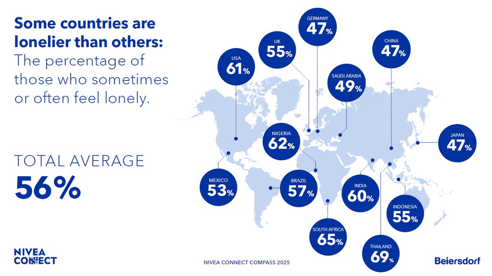 จากผลการศึกษาระดับโลก NIVEA CONNECT Compass 2025 ที่จัดทำใน 13 ประเทศ พบว่า กว่าครึ่งของผู้คนทั่วโลกเคยรู้สึกเหงาอย่างน้อยบางครั้ง และ 1 ใน 5 คนรู้สึกเหงาเป็นประจำ ความโดดเดี่ยวส่งผลกระทบลึกซึ้งทั้งด้านจิตใจและร่างกาย หลายคนเผชิญกับความเครียด ความเศร้า ภาวะซึมเศร้า และความรู้สึกหมดหนทาง