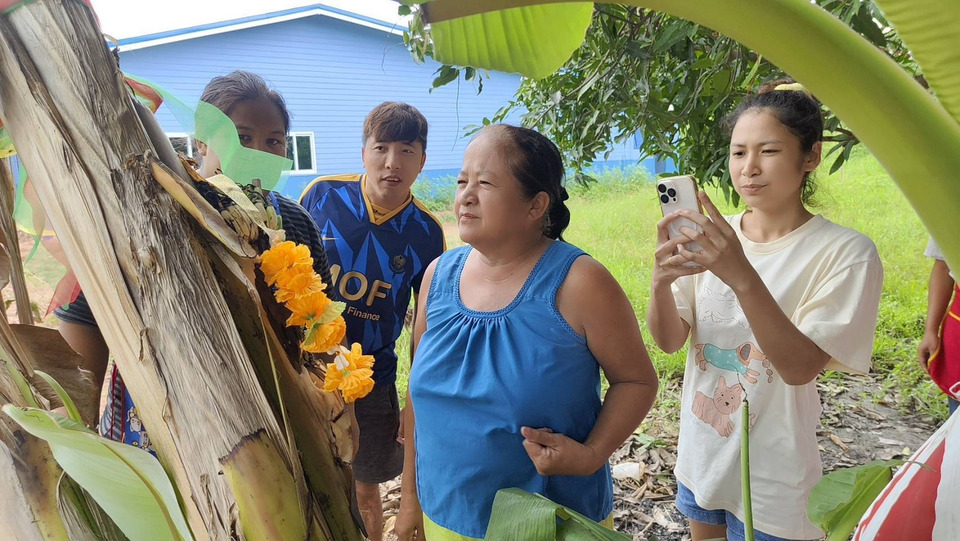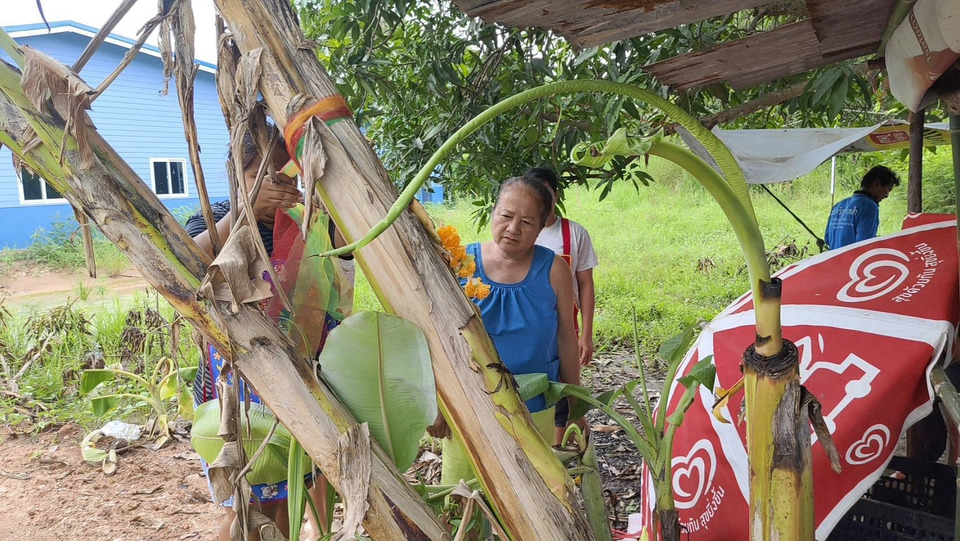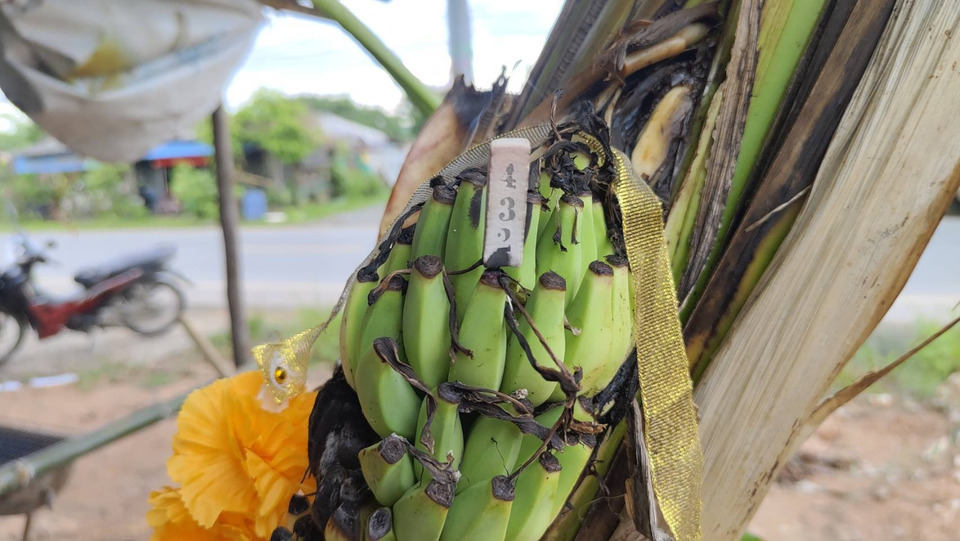 วันที่ 14 ต.ค.68 ผู้สื่อข่าวรายงานว่า บริเวณข้างร้านส้มตำครกแตก by ช้างน้อย หมู่ 11 ตำบลพรหมณี อำเภอเมือง จังหวัดนครนายกได้มีชาวบ้านพากันมามุงดูต้นกล้วยน้ำว้าแปลกแหวกต้นออกเครือไร้หัวปลี ซึ่งบริเวณดังกล่าวได้มีต้นกล้วยอยู่ 3 ต้น ต้นหนึ่งถูกตัดทิ้งอีกต้นนึงออกเครือออกลูกแล้วส่วนต้นที่แปลกสุดคือแหวกต้นออกลูก ซึ่งกล้วยลักษณะนี้ชาวบ้านบอกไม่เคยเห็นมาก่อนเห็นแต่หัวปลีออกมากลางต้นแต่ต้นนี้ออกมาแปลกๆ ซึ่งทำเอาชาวบ้านหลายคนต่างมีความเชื่อว่าต้นกล้วยต้นนี้ต้องให้โชค จากนั้นก็ไม่พลาดพากันนำผ้าสามสีพร้อมธูปเทียนมากราบไหว้ขอโชคจากต้นกล้วย ได้เลขจากธูปมงคล 432และนับหวีกล้วยได้ 12 หวี ส่วนลูกกล้วยนั้นไม่สามารถนับได้เพราะลูกมันยังเล็ก