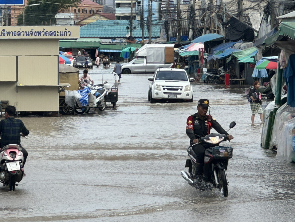 อ.อรัญประเทศ จ.สระแก้ว นานกว่า 2 ชม.ทำให้น้ำฝนจากพื้นที่ ต.ป่าไร่ อ.อรัญประเทศ จ.สระแก้ว ได้ไหลหลากเข้าท่วมถนนศรีเพ็ญ ซึ่งเป็นถนนเลียบแนวชายแดน บริเวณหน้าศูนย์การค้าอินโดจีนและตลาดโรงเกลือ ตลาดการค้าชายแดน อ.อรัญประเทศ จ.สระแก้ว ระดับน้ำท่วมสูงประมาณ 30-50 ซม.รถเล็กสัญจรไปมาลำบาก