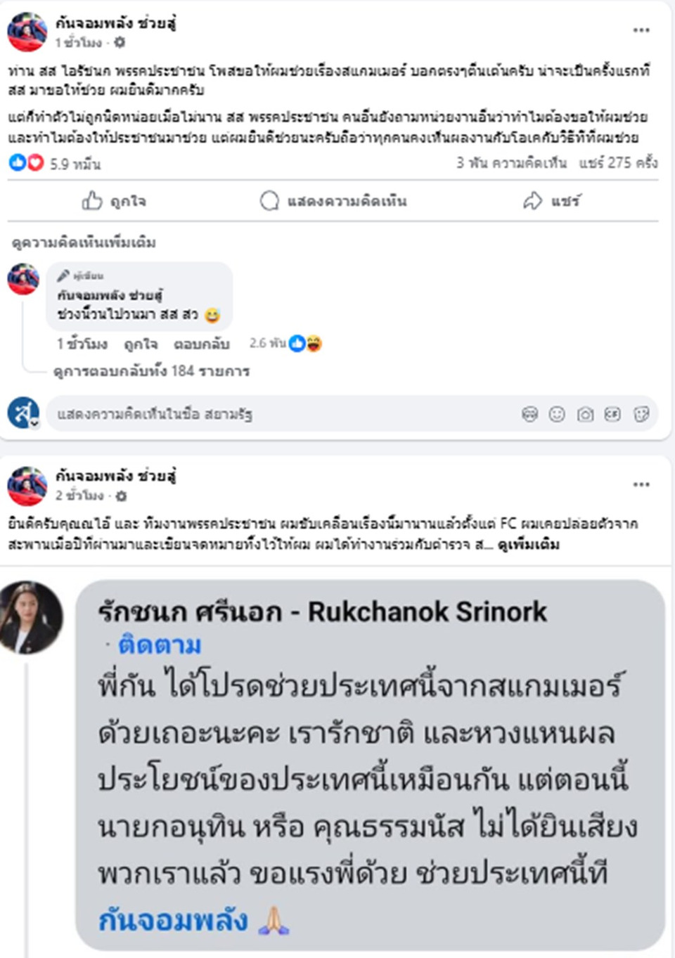 น.ส.รักชนก ระบุข้อความเชิงตัดพ้อว่า“พี่กัน ได้โปรดช่วยประเทศนี้จากสแกมเมอร์ด้วยเถอะนะคะ เรารักชาติและหวงแหนผลประโยชน์ของประเทศนี้เหมือนกัน แต่ตอนนี้นายกฯ อนุทิน หรือคุณธรรมนัส ไม่ได้ยินเสียงพวกเราแล้ว ขอแรงพี่ด้วย ช่วยประเทศนี้ที กัน จอมพลัง”