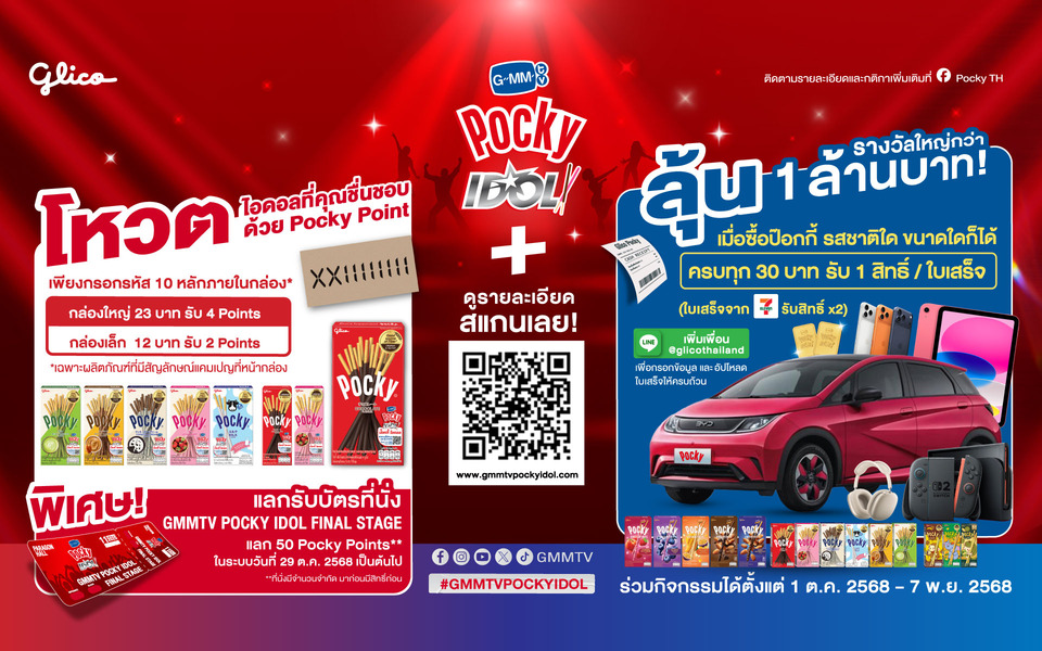 ใครจะเป็น #GMMTVPOCKYIDOL ของเมืองไทย!? ติดตามความเคลื่อนไหว พร้อมร่วมโหวตให้น้องๆ ทั้ง 20 คน ได้ที่ www.gmmtvpockyidol.com ตั้งแต่วันนี้ – 7 พฤศจิกายน 2568 นี้ พร้อมประกาศผลรอบ Final ในวันอาทิตย์ที่ 9 พฤศจิกายน 2568 ณ พารากอน ฮอลล์ ศูนย์การค้าสยามพารากอน