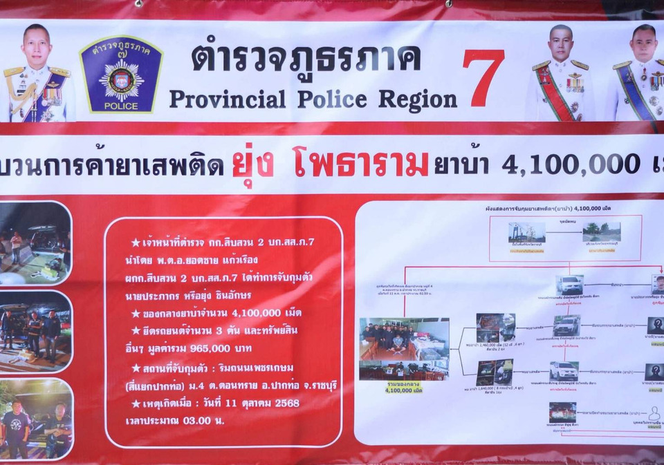 เมื่อวันอังคารที่ 14 ตุลาคม 2568 ที่หน้าอาคารตำรวจภูธรภาค 7 จังหวัดนครปฐม พล.ต.ท.พิสิฐ ตันประเสริฐ ผู้บัญชาการตำรวจภูธรภาค 7 พร้อมด้วย นางสาวอโรชา นันทมนตรี ผู้ว่าราชการจังหวัดนครปฐม, พล.ต.ต.ชมชวิณ ปุระธนานนท์, พล.ต.ต.ปิติ นฤขัตรพิชัย, พล.ต.ต.ประสพชัย มัตสยะวนิชกูล รองผู้บัญชาการตำรวจภูธรภาค 7, และ พล.ต.ต.กานต์ ธรรมเกษม ผู้บังคับการสืบสวนตำรวจภูธรภาค 7 ร่วมกันแถลงผลการจับกุมขบวนการค้ายาเสพติดรายสำคัญ