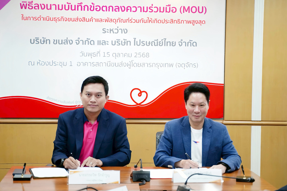 วันที่ 15 ตุลาคม 2568 นายอรรถวิท รักจำรูญ กรรมการผู้จัดการใหญ่ บริษัท ขนส่ง จำกัด (บขส.) พร้อมด้วย ดร.ดนันท์ สุภัทรพันธุ์ กรรมการผู้จัดการใหญ่ บริษัท ไปรษณีย์ไทย จำกัด (ปณท) ร่วมลงนามบันทึกข้อตกลงความร่วมมือ (MOU) เพื่อร่วมกันพัฒนา ส่งเสริม สนับสนุนในการทำงานร่วมกัน เพิ่มประสิทธิภาพในการให้บริการประชาชนในการฝากส่งสินค้าและพัสดุภัณฑ์ โดยมีคณะผู้บริหารของทั้ง 2 หน่วยงานเข้าร่วมฯ ณ ห้องประชุม อาคารสถานีขนส่งผู้โดยสารกรุงเทพ (จตุจักร)