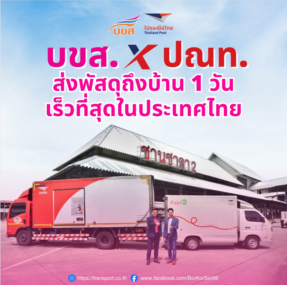 การผนึกกำลังกับไปรษณีย์ไทยในครั้งนี้ เป็นการต่อยอดศักยภาพในการให้บริการขนส่งรับ – ส่งพัสดุภัณฑ์ ให้ครอบคลุมที่เชื่อมโยงทุกภูมิภาคเข้าด้วยกันผ่านจุดศูนย์กลางสำคัญ เช่น สถานีขนส่งฯ หมอชิต 2, เอกมัย และสายใต้ใหม่ ซึ่งถือเป็นจุดยุทธศาสตร์หลักของประเทศ ในการขนส่งผู้โดยสารและพัสดุในเส้นทางระยะไกล โดย บขส. จะทำหน้าที่เป็นโครงข่ายขนส่งระยะกลาง (Middle-Mile Transporter) เพื่อเชื่อมต่อพัสดุจากต้นทางของผู้ฝากในภูมิภาคต่าง ๆ เข้าสู่ระบบของไปรษณีย์ไทยอย่างเป็นระบบและมีมาตรฐานเดียวกัน สอบถามรายละเอียดเพิ่มเติมได้ที่ ศูนย์รับ – ส่งพัสดุภัณฑ์ (จตุจักร) หรือหมอชิต 2 โทร. 02 – 537 – 8480