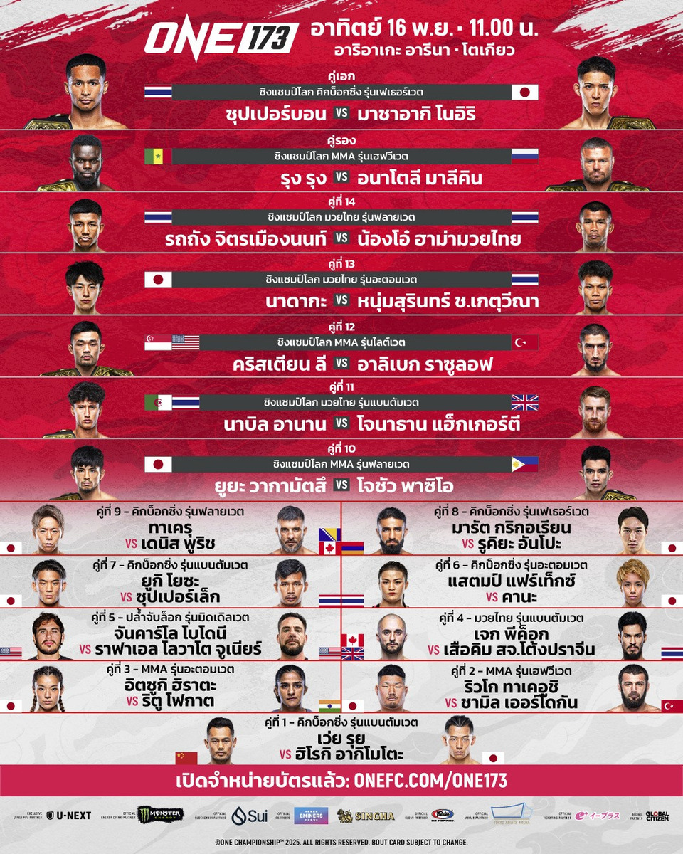 * โปรแกรมการแข่งขันทุกคู่ ศึก ONE 173