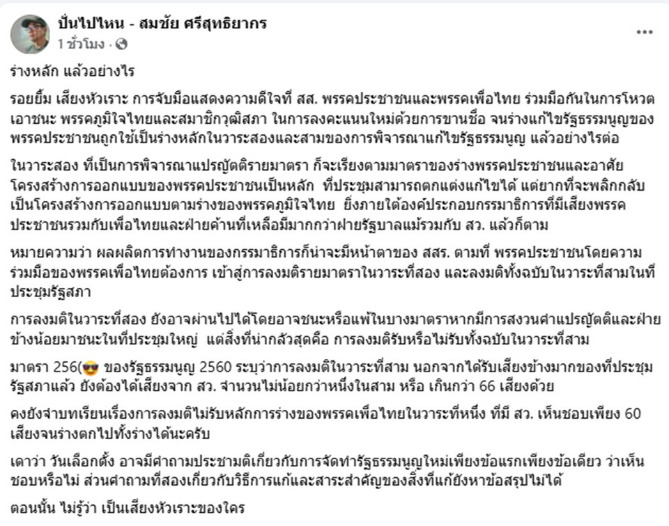 รอยยิ้ม เสียงหัวเราะ การจับมือแสดงความดีใจที่ สส. พรรคประชาชนและพรรคเพื่อไทย ร่วมมือกันในการโหวตเอาชนะ พรรคภูมิใจไทยและสมาชิกวุฒิสภา ในการลงคะแนนใหม่ด้วยการขานชื่อ จนร่างแก้ไขรัฐธรรมนูญของพรรคประชาชนถูกใช้เป็นร่างหลักในวาระสองและสามของการพิจารณาแก้ไขรัฐธรรมนูญ แล้วอย่างไรต่อ