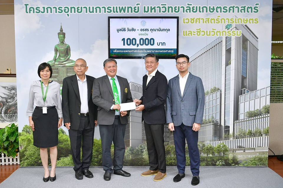 วันที่ 17 ต.ค.68 ดร.ดำรงค์ ศรีพระราม รักษาการแทนอธิการบดีมหาวิทยาลัยเกษตรศาสตร์ รับมอบเงินบริจาค จำนวน 100,000 บาท จาก มูลนิธิ วันชัย-อรชร คุณานันทกุล เพื่อร่วมสมทบการสร้างคณะแพทยศาสตร์และโรงพยาบาลเกษตรศาสตร์ โอกาสนี้ ผศ.ดร.นุชนาถ มั่งคั่ง รองอธิการบดีฝ่ายการเงินและบริหารทรัพย์สิน ร่วมเป็นสักขีพยาน ณ ห้องอธิการบดี อาคารสารนิเทศ 50 ปี มหาวิทยาลัย เกษตรศาสตร์