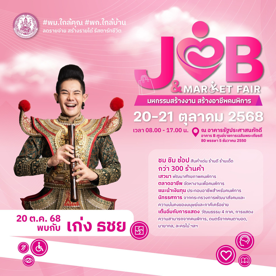 กระทรวงการพัฒนาสังคมและความมั่นคงของมนุษย์ (พม.) โดยกรมส่งเสริมและพัฒนาคุณภาพชีวิตคนพิการ (พก.) เตรียมจัดงาน “Job & Market Fair : มหกรรมสร้างงาน สร้างอาชีพคนพิการ” ระหว่างวันที่ 20–21 ตุลาคม 2568 ณ อาคารรัฐประศาสนภักดี (อาคาร B) ศูนย์ราชการเฉลิมพระเกียรติ ฯ แจ้งวัฒนะ กรุงเทพ ฯ ภายใต้นโยบายของนายอัครา พรหมเผ่า รัฐมนตรีว่าการกระทรวงการพัฒนาสังคมและความมั่นคงของมนุษย์ (พม.) “พม.ใกล้คุณ พก.ใกล้บ้าน ลดรายจ่าย สร้างรายได้ รีสตาร์ทชีวิต” เพื่อสร้างโอกาสที่ยั่งยืนให้แก่คนพิการและครอบครัว ผ่านความร่วมมือจากทุกภาคส่วน ทั้งภาครัฐ เอกชน สถาบันการศึกษา และภาคประชาสังคม โดยภายในงานจะมีตลาดอาชีพและสินค้าคนพิการกว่า 300 ร้านค้า , เวทีเสวนาและเวิร์กช็อปสร้างแรงบันดาลใจ ในการประกอบอาชีพยุคใหม่ , การสาธิตอาชีพเชิงสร้างสรรค์ , พิธีลงนาม MOU “เสริมสร้างโอกาสการจ้างงานและการประกอบอาชีพ” , พิธีมอบรางวัล “We Can Do” เชิดชูคนพิการต้นแบบ และหน่วยงานสนับสนุนงานด้านคนพิการ , นิทรรศการจาก พม. และภาคีเครือข่าย ถ่ายทอดนวัตกรรมและผลงานเด่น , การแสดงความสามารถของคนพิการ รวมถึงการแสดงทางวัฒนธรรมร่วมสมัย และมินิคอนเสิร์ตจากศิลปินชั้นนำ