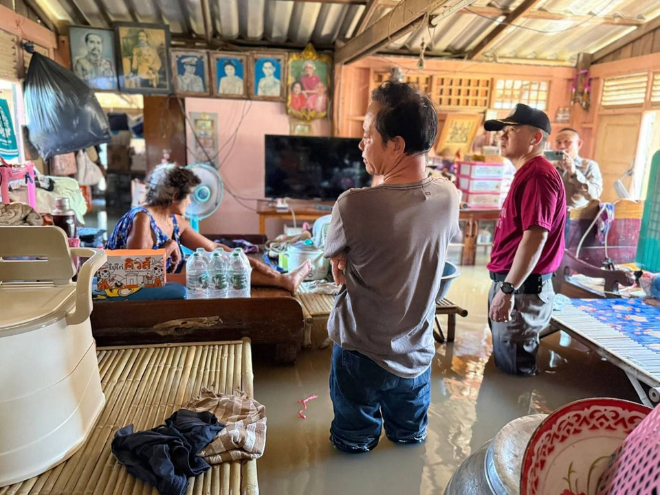 พร้อมด้วยเจ้าหน้าที่สายตรวจตำบลโผงเผง และผู้ใหญ่บ้านหมู่ที่ 7 ตำบลโผงเผงลงพื้นที่เยี่ยม นางอำนวยพร แสงประเสริฐ อายุ 76 ปี ผู้ป่วยอัมพฤกษ์แขนขวา พักอาศัยอยู่ในบ้านที่ถูกน้ำท่วมสูงกว่า 60 เซนติเมตรนานกว่า 6 สัปดาห์ โดยมอบน้ำดื่มและไข่ไก่ เพื่อบรรเทาความเดือดร้อนและสร้างขวัญกำลังใจให้กับผู้ป่วยและครอบครัว