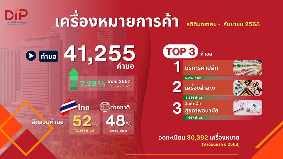 1) เครื่องหมายการค้า มีการยื่นคำขอ 41,255 คำขอ เพิ่มขึ้น 7.28% เมื่อเทียบกับช่วงเวลาเดียวกันในปี 2567 (38,455 คำขอ) โดยมีสัดส่วนผู้ยื่นคำขอคนไทย 52% และต่างชาติ 48% สำหรับกลุ่มสินค้าที่มีการยื่นขอรับความคุ้มครองเครื่องหมายการค้ามากที่สุด 3 อันดับแรก ได้แก่ กลุ่มบริการค้าปลีก (5,287 คำขอ) กลุ่มสินค้าเครื่องสำอาง (5,236 คำขอ) และกลุ่มสินค้าเพื่อสุขภาพอนามัย (4,667 คำขอ) ทั้งนี้ สินค้าเพื่อสุขภาพอนามัยเป็นกลุ่มที่มาแรงและได้รับการจดทะเบียนมากที่สุด 3,692 เครื่องหมาย เพิ่มขึ้น 57% จากปี 2567 (2,339 เครื่องหมาย) โดยเป็นคำขอที่ได้รับจดผ่านช่องทาง Fast Track จำนวน 1,525 เครื่องหมาย สะท้อนเทรนด์การค้าที่มุ่งตอบโจทย์ผู้บริโภคยุคใหม่ซึ่งให้ความสำคัญกับเรื่องสุขภาพอนามัยมากขึ้น ทั้งนี้ ตัวเลขการจดทะเบียนเครื่องหมายการค้า ในช่วง 9 เดือนแรกของ