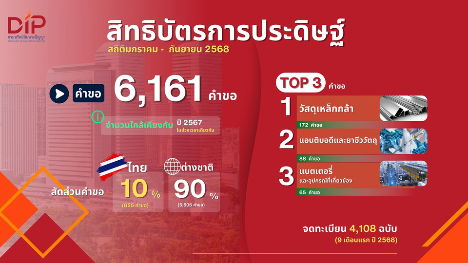 2) สิทธิบัตรการประดิษฐ์ มีการยื่นคำขอ 6,161 คำขอ ซึ่งตัวเลขใกล้เคียงกับช่วงเวลาเดียวกันของปี 2567 (6,071 คำขอ) โดยมีสัดส่วนผู้ยื่นคำขอคนไทย 10% และต่างชาติ 90% อาทิ สหรัฐอเมริกา ญี่ปุ่น ฟินแลนด์ เป็นต้น สำหรับนวัตกรรมที่มีการยื่นขอรับความคุ้มครองสิทธิบัตรการประดิษฐ์มากที่สุด 3 อันดับแรก ได้แก่ วัสดุเหล็กกล้า (172 คำขอ) ซึ่งครองอันดับ 1 สองปีติดต่อกัน สะท้อนให้เห็นถึงอุตสาหกรรมวัสดุและการก่อสร้างที่มีการพัฒนานวัตกรรมอย่างต่อเนื่อง รองลงมาคือนวัตกรรมแอนติบอดี้และยาชีววัตถุ (88 คำขอ) สะท้อนความสนใจที่เพิ่มขึ้นในด้านเทคโนโลยีชีวภาพและการวิจัยยา ตามด้วยนวัตกรรมแบตเตอรีและอุปกรณ์ที่เกี่ยวข้อง (65 คำขอ) ซึ่งสะท้อนภาพรวมของตลาดรถยนต์ไฟฟ้าในไทยที่เติบโตขึ้นจากปีที่ผ่านมา ทั้งนี้ ตัวเลขการจดทะเบียนสิทธิบัตรการประดิษฐ์ ในช่วง 9 เดือนแรกของปี 2568 อยู่ที่ 4,108 ฉบับ