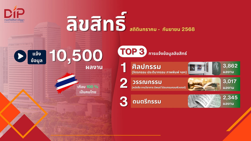 5) ลิขสิทธิ์ มีการยื่นแจ้งข้อมูล 10,500 ผลงาน ผู้แจ้งเกือบทั้งหมดเป็นคนไทย ผลงานที่มีการแจ้งข้อมูลลิขสิทธิ์มากที่สุด 3 อันดับแรก ได้แก่ ศิลปกรรม (จิตรกรรม ประติมากรรม ภาพพิมพ์ ฯลฯ) 3,862 ผลงาน วรรณกรรม (งานนิพนธ์ โปรแกรมคอมพิวเตอร์) 3,017 ผลงาน และดนตรีกรรม 2,345 ผลงาน ทั้งนี้ ลิขสิทธิ์เป็นทรัพย์สินทางปัญญาที่ได้รับความคุ้มครองทันทีที่สร้างสรรค์ โดยไม่ต้องยื่นจดทะเบียนกับกรม สถิติดังกล่าวจึงไม่สามารถสะท้อนภาพรวมของงานสร้างสรรค์ไทยได้ทั้งหมด อย่างไรก็ดี กรมจะเดินหน้าส่งเสริมให้ศิลปินนักสร้างสรรค์เห็นความสำคัญของการแจ้งข้อมูลลิขสิทธิ์กับกรม เพื่อเป็นหลักฐานอ้างอิงเบื้องต้นในการแสดงความเป็นเจ้าของลิขสิทธิ์ในกรณีที่เกิดข้อพิพาท รวมทั้งเป็นช่องทางให้ผู้อื่นสามารถเข้าถึงผลงานและติดต่อขอใช้ประโยชน์งานลิขสิทธิ์นั้นได้ง่ายขึ้น