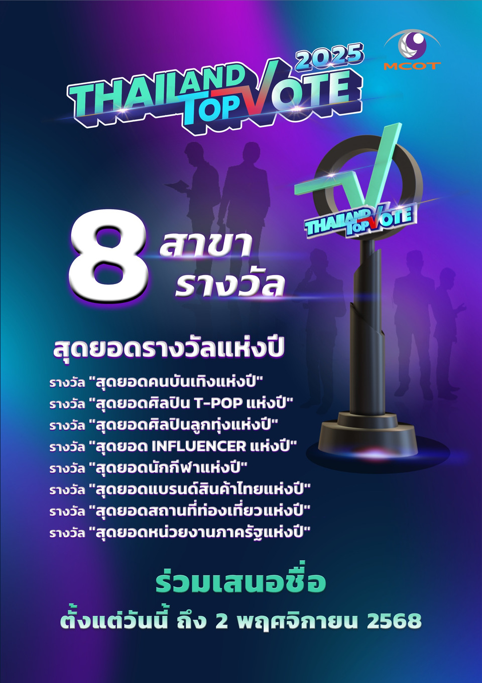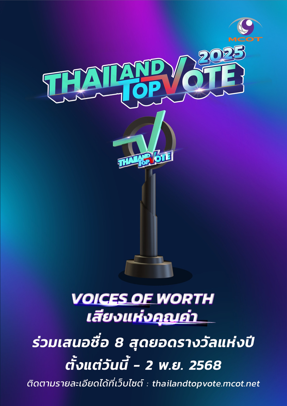 สาย SUPPORT ห้ามพลาดกับรางวัลที่สร้างความภาคภูมิใจ สร้างแรงบันดาลใจ พร้อมกำลังใจ ให้กับบุคคลและองค์กรในหลากหลายวงการ จากการร่วมมือระหว่าง บริษัท อสมท จำกัด (มหาชน) และ บริษัท ไปรษณีย์ไทย จำกัด “Thailand Top Vote 2025” VOICES OF WORTH เสียงแห่งคุณค่า กับ 8 รางวัลที่มาจากการโหวตของคนทั้งประเทศ โดยมีสถาบันบัณฑิตพัฒน บริหารศาสตร์ (นิด้า) สนับสนุนการทำโพล พร้อม 2 รางวัลเกียรติยศ สุดยอดนักบริหารแห่งปี จากภาครัฐและภาคเอกชน จากการคัดเลือกจากคณะกรรมการผู้ทรงคุณวุฒิ