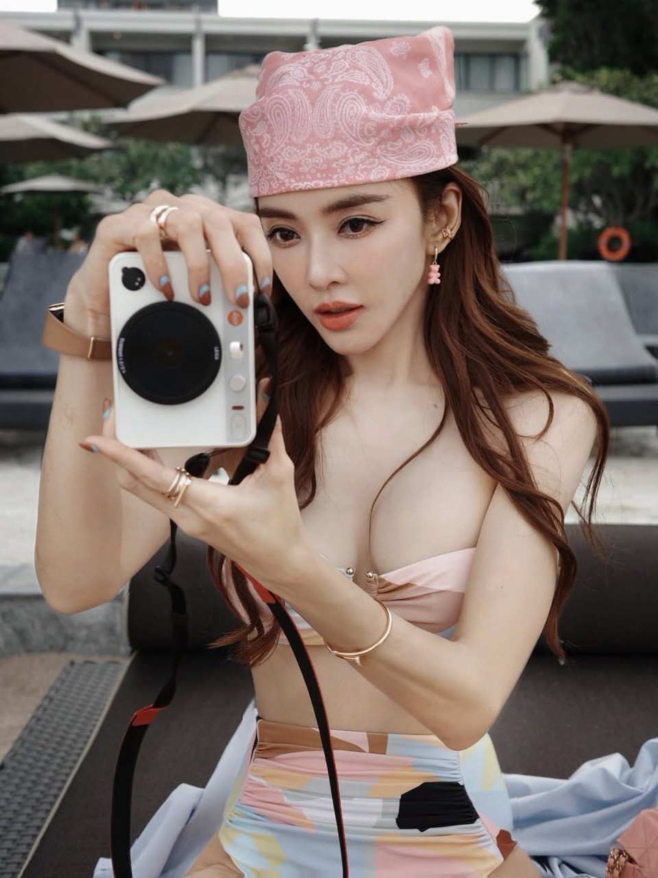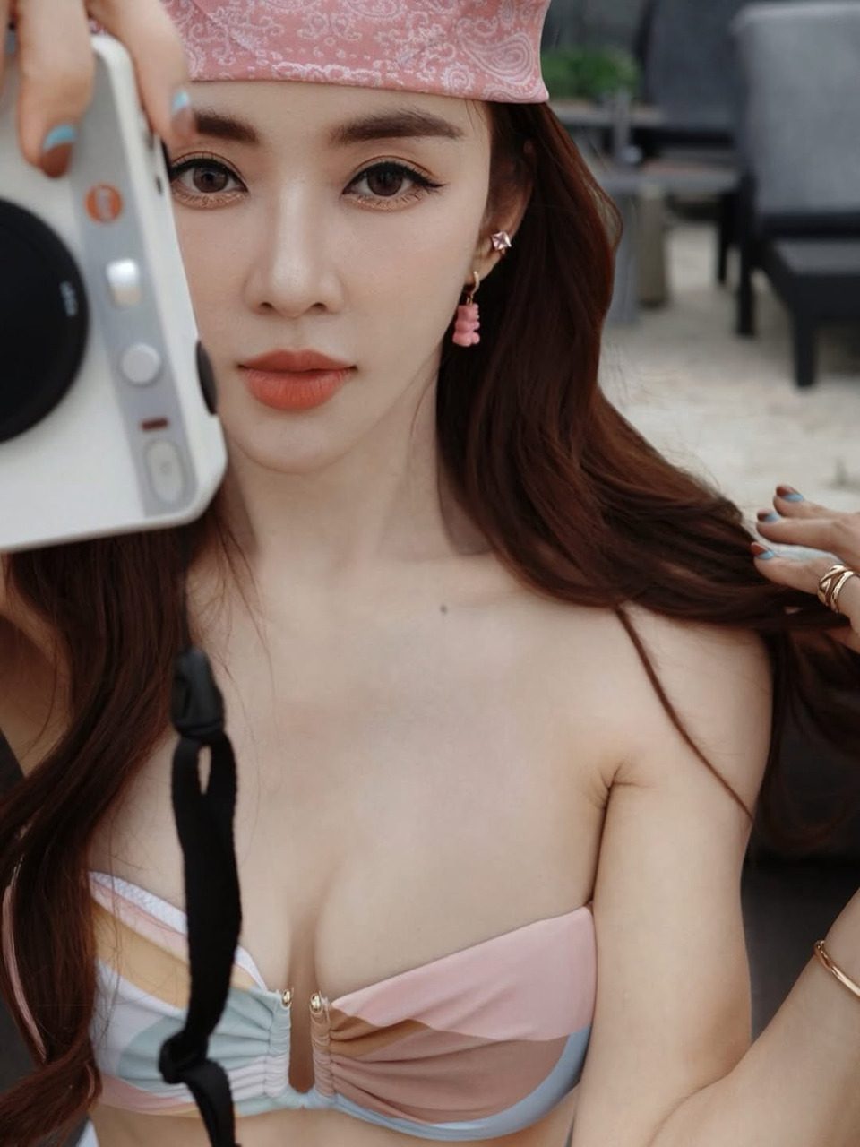 โดยในภาพ “เป้ย” สวมผ้าคาดศีรษะลายลูกไม้สีชมพูอ่อน เข้าคู่กับชุดว่ายน้ำโทนพาสเทล พร้อมถือกล้องถ่ายภาพด้วยท่วงท่าน่ารักเป็นธรรมชาติ แต่กลับสะกดทุกสายตาด้วยเสน่ห์อันละมุนละไมและออร่าความสวยที่ไม่เคยจาง