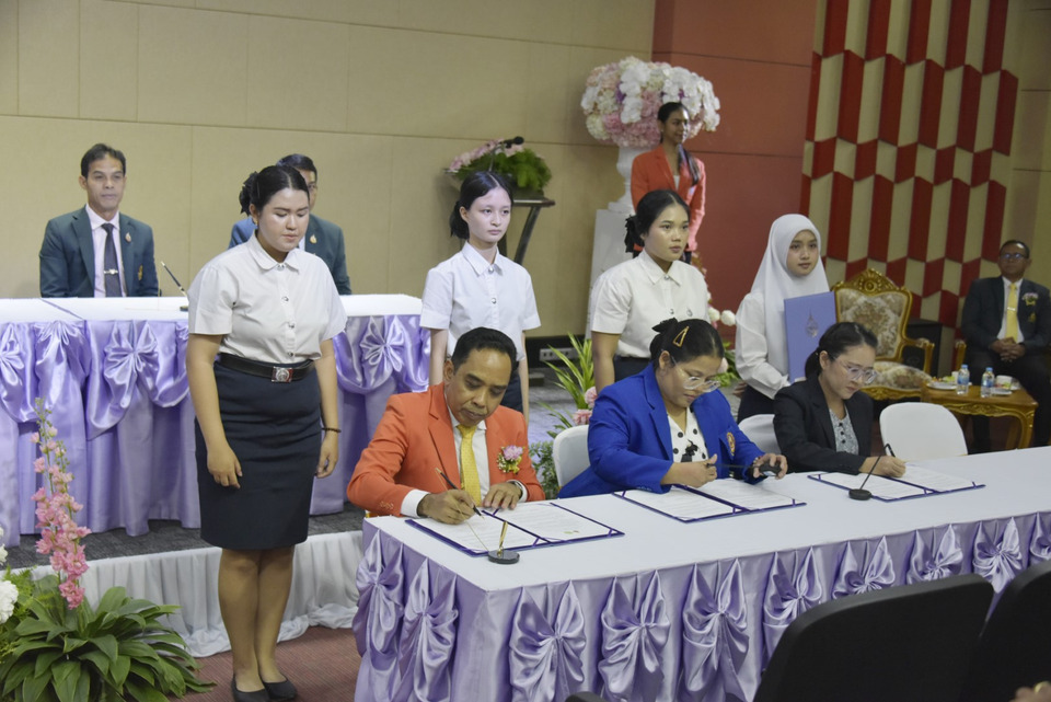 เมื่อวันที่ 20 ตุลาคม 2568 ศาสตราจารย์ ดร.สมบัติ ธำรงธัญวงศ์ อธิการบดีมหาวิทยาลัยวลัยลักษณ์ และ ดร.สุภาพ เต็มรัตน์ ผู้อำนวยการสำนักงานเขตพื้นที่การศึกษามัธยมศึกษานครศรีธรรมราช (สพม.นศ.) ดร.ภาวินทร์ ณ พัทลุง รองนายกเทศมนตรีนครนครศรีธรรมราช นายณรงค์พร ณ พัทลุง นายกเทศมนตรีนครหาดใหญ่และผู้อำนวยการโรงเรียน จำนวน 71 แห่งในสังกัดสพม.นศ. ร่วมกันลงนามในบันทึกข้อตกลงความร่วมมือทางวิชาการด้านการศึกษา เพื่อร่วมกันพัฒนาทางวิชาการ การวิจัย การจัดการเรียนการสอน และการทำนุบำรุงศิลปวัฒนธรรมร่วมกัน ตลอดจนสนับสนุนนักศึกษาทั้งระดับปริญญาตรี โทและเอก ในการฝึกปฏิบัติวิชาชีพและฝึกปฏิบัติการสอนในสถานศึกษา โดยมีผู้บริหาร คณาจารย์ นักศึกษา และแขกผู้มีเกียรติร่วมเป็นสักขีพยาน ณ ห้องประชุมศรีธรรมราช อาคารปฏิบัติการสถาปัตยกรรมและการออกแบบ มหาวิทยาลัยวลัยลักษณ์