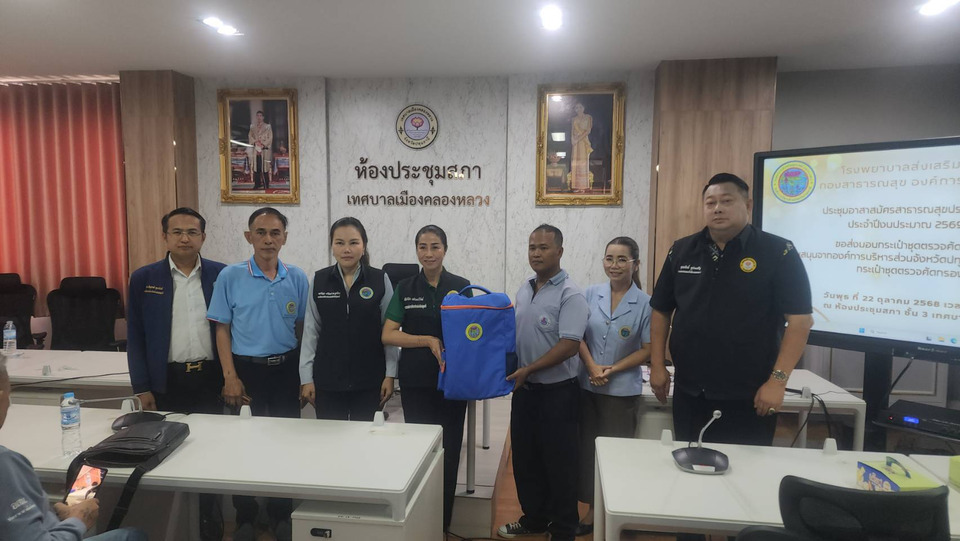วันที่ 22 ตุลาคม 2568 ที่ห้องประชุมสภาเทศบาลเมืองคลองหลวง จ.ปทุมธานี พลตำรวจโท คำรณวิทย์ ธูปกระจ่าง นายกองค์การบริหารส่วนจังหวัดปทุมธานี มอบหมายให้นางสาวพัชร์ชิสา พชิระธารีรัตน์ รองนายกองค์การบริหารส่วนจังหวัดปทุมธานี เข้าร่วมการประชุมอาสาสมัครสาธารณสุขประจำหมู่บ้าน (อสม.) และมอบกระเป๋าชุดตรวจคัดกรองสุขภาพให้กับ รพ.สต. ในสังกัด เทศบาลเมืองคลองหลวง โดยมี นายยุทธศักดิ์ ชูประเสริฐ นายกเทศมนตรีเมืองคลองหลวง นายทองสุก แสนจักร สมาชิกสภา อบจ.เขตเลือกตั้งที่ 3 อ.คลองหลวง นางสาวพรปริญญา ศรีจันทร์ สมาชิกสภา อบจ.เขตเลือกตั้งที่ 5 อ.คลองหลวง นายสัญชาติ คุระนันท์ สมาชิกสภา อบจ.เขตเลือกตั้งที่ 7 อ.คลองหลวง และคณะผู้บริหารเทศบาลเมืองคลองหลวงเข้าร่วม โดยมี อสม ในพื้นที่ คลองสองเข้าร่วมรับ กว่า 100 คน