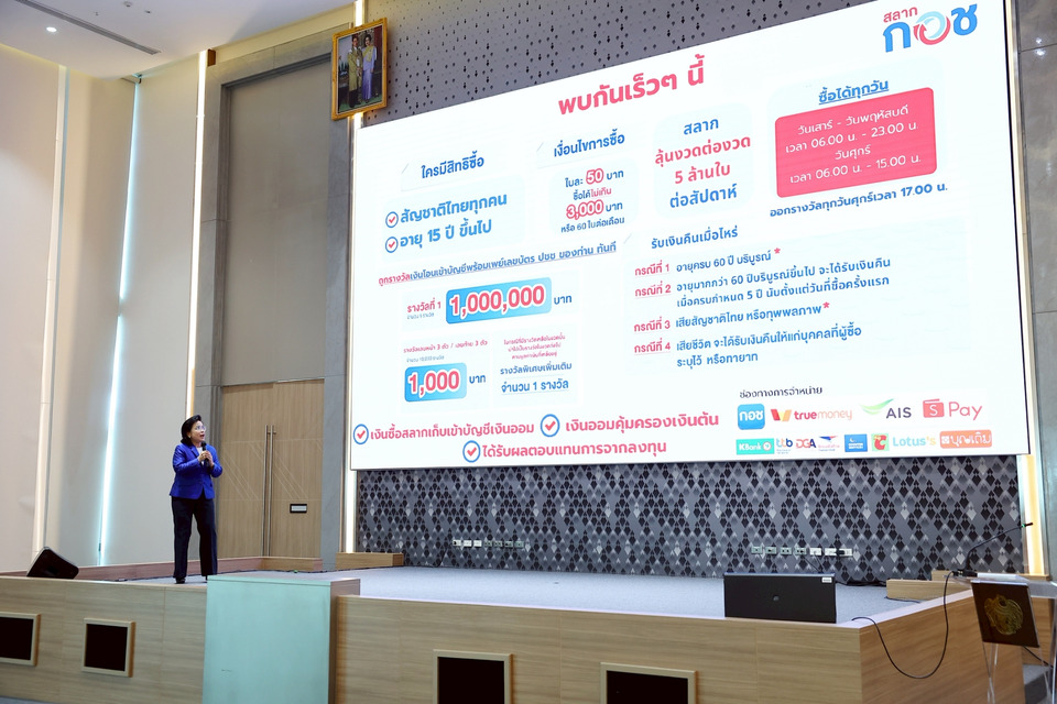 นางสาวจารุลักษณ์ กล่าวเพิ่มเติมว่า สลาก กอช.” เป็นสลากขูดดิจิทัลที่ผสมผสานการออมเข้ากับการลุ้นรางวัล ภายใต้แนวคิด “ลุ้นโชคเงินไม่หาย เงินทุกบาทกลายเป็นเงินออม” เปิดโอกาสให้คนไทยทุกกลุ่ม อายุ 15 ปีขึ้นไป ได้ลุ้นรางวัลและออมเงิน ไปพร้อมกัน จำหน่ายใบละ 50 บาท ซื้อได้สูงสุด 3,000 บาท หรือ 60 ใบต่อเดือน ออกรางวัลทุกวันศุกร์ เวลา 17.00 น. รางวัลแบ่งเป็น รางวัลที่ 1 มูลค่า 1 ล้านบาท จำนวน 5 รางวัล และ รางวัลที่ 2 มูลค่า 1,000 บาท จำนวน 10,000 รางวัล สำหรับผู้สูงอายุ 60 ปีขึ้นไป สามารถซื้อได้โดยต้องออมไว้อย่างน้อย 5 ปี และสามารถซื้อได้ไม่จำกัดรอบ หากผู้ซื้อเสียชีวิต เงินออมทั้งหมดจะตกสู่ทายาทตามกฎหมายหรือบุคคลที่ผู้ซื้อระบุไว้