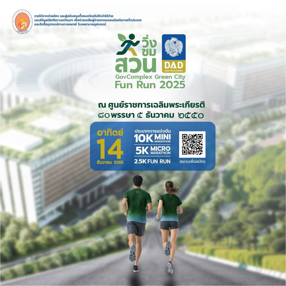 ธพส. โชว์ความสำเร็จพัฒนาพื้นที่ศูนย์ราชการเฉลิมพระเกียรติฯ สู่เมืองสีเขียวกว่า 138 ไร่ ชวนประชาชนทดลองใช้พื้นที่ และสร้างประสบการณ์ใหม่ด้วยกิจกรรมมินิมาราธอน“วิ่งชมสวน : GovComplex Green City Fun Run 2025” นัดหมาย 14 ธันวาคม 68 พร้อมเปลี่ยนทุกก้าวเป็นพลัง สมทบทุนมูลนิธิศรีสวางควัฒนฯ เพื่อผู้ป่วยด้อยโอกาสทั่วประเทศ-จัดซื้ออุปกรณ์ทางการแพทย์ รพ.จุฬาภรณ์ เปิดรับสมัครตั้งแต่วันที่ 22 ตุลาคม เป็นต้นไปที่ http://race.thai.run/govgreencityfunrun2025