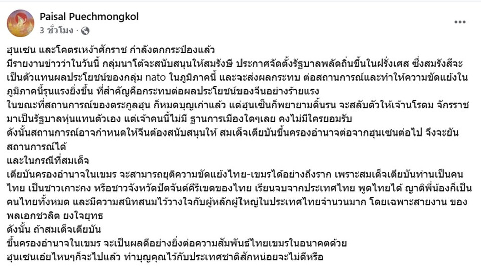 ดังนั้น ถ้าสมเด็จ เตีย บันห์ ขึ้นครองอำนาจในเขมร จะเป็นผลดีอย่างยิ่งต่อความสัมพันธ์ไทยเขมรในอนาคตด้วย ฮุนเซนเอ๋ยไหนๆ ก็จะไปแล้ว ทำบุญคุณไว้กับประเทศชาติสักหน่อยจะไม่ดีหรือ"