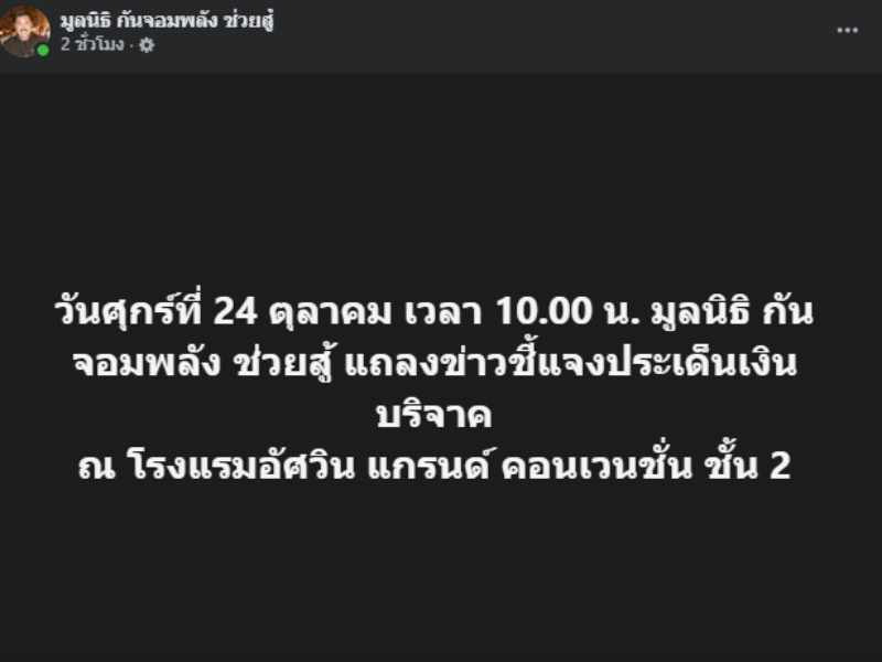 ล่าสุด วันนี้ (23 ส.ค.68)า เฟซบุ๊ก มูลนิธิ กันจอมพลัง ช่วยสู้ โพสต์ข้อความระบุว่า...