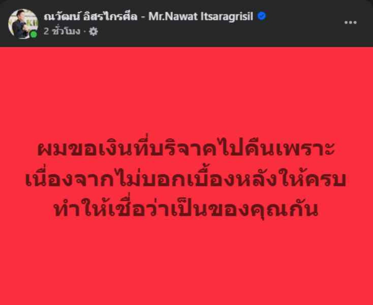 ล่าสุด วันนี้ (24 ต.ค.68) "บอสณวัฒน์" โพสต์ข้อความทวงเงินบริจาคดังกล่าวคืนผ่านเฟซบุ๊ก ณวัฒน์ อิสรไกรศีล - Mr.Nawat Itsaragrisil ระบุว่า...