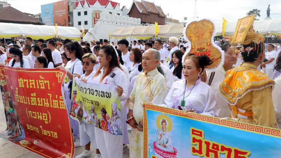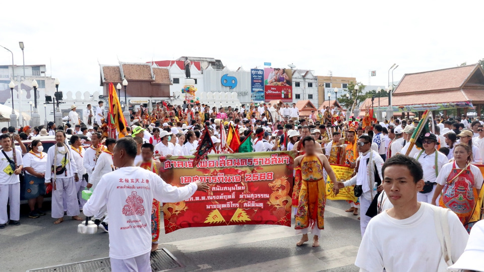 โดยมี 30 ศาลเจ้า อัญเชิญม้าทรงชายหญิงกว่า 100 ร่าง แสดงอิทธิฤทธิ์ใช้ของมีคมทิ่มแทงตามร่างกายสร้างความหวาดเสียวก่อนจุดประทัด 1 แสนดอก เอาฤกษ์เอาชัย จากนั้นได้เคลื่อนขบวนประทับทรงเทพเจ้าแห่ไปตามเส้นทางที่เป็นย่านการค้า เพื่อให้คนไทยเชื้อสายจีนตั้งโต๊ะหมู่สักการะกราบไหว้เปลี่ยนธูปเทพเจ้าของขบวนแห่อันศักดิ์สิทธิ์และสร้างความเป็นสิริมงคลในชีวิตและครอบครัวตลอดระยะทางกว่า 6 กิโลเมตร