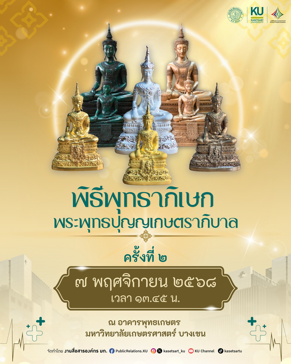มหาวิทยาลัยเกษตรศาสตร์ ขอเชิญพุทธศาสนิกชน และผู้สนใจ ร่วมในพิธีพุทธาภิเษก "พระพุทธปุญญ เกษตราภิบาล” ครั้งที่ 2 ในวันศุกร์ที่ 7 พฤศจิกายน 2568 เวลา 13.45-15.00 น. ณ อาคารพุทธเกษตร มหาวิทยาลัยเกษตรศาสตร์ (บางเขน) โดยมหาวิทยาลัยเกษตรศาสตร์ ได้รับเมตตาจากพระเดชพระคุณ พระพรหมวัชรสุทธาจารย์ ที่ปรึกษาเจ้าคณะภาค 10 ธรรมยุต รองแม่กองบาลีสนามหลวงเจ้าอาวาสวัดอาวุธวิกสิตาราม เป็นประธานสงฆ์