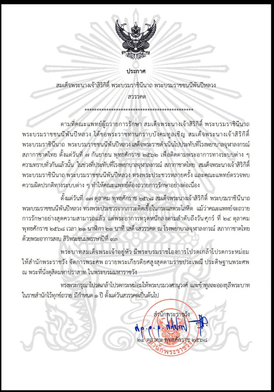 เมื่อเวลา 01.58 น.วันที่ 25 ตุลาคม สำนักพระราชวังออกประกาศว่า สมเด็จพระนางเจ้าสิริกิติ์ พระบรมราชินีนาถ พระบรมราชชนนีพันปีหลวง สวรรคต ความว่า