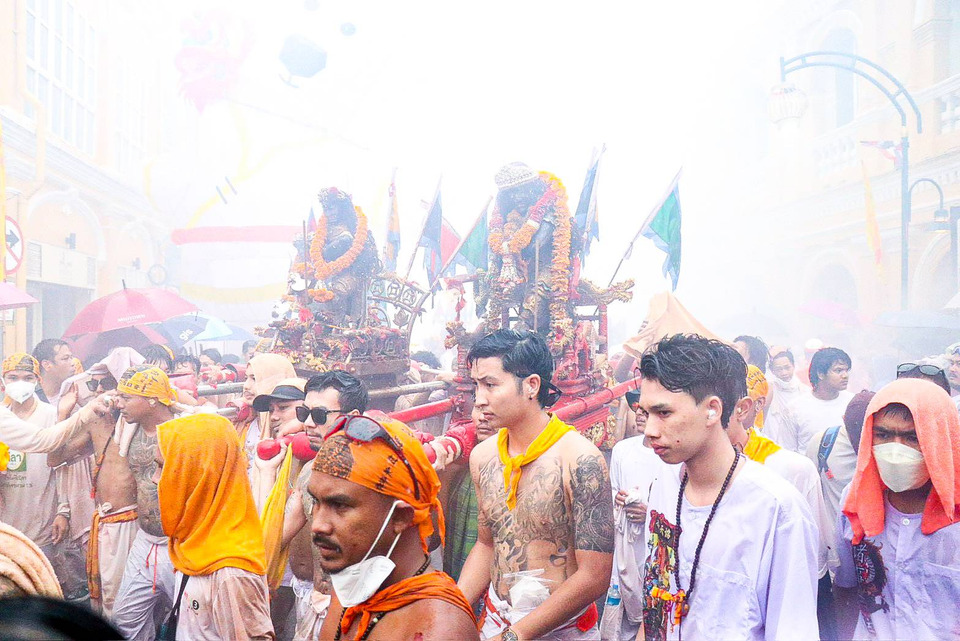 ขบวนได้ตั้งบริเวณสี่แยกมหาวิทยาลัยราชภัฏภูเก็ต ก่อนเคลื่อนเข้าสู่ถนนเทพกระษัตรี ผ่านถนนสายต่าง ๆ ในตัวเมืองภูเก็ต มุ่งหน้าสู่สะพานหิน เพื่อประกอบพิธีอัญเชิญควันธูปเทียนกลับไปยังศาลเจ้า ซึ่งภายในขบวนมีม้าทรงทั้งชายและหญิงร่วมแสดงอิทธิฤทธิ์ โดยใช้อาวุธและของมีคมหลากหลายชนิด ทั้งของจริงและของจำลอง อาทิ มีดดาบ เหล็กแหลม เคียวเกี่ยวข้าว บารากู่ และปืนจำลอง เป็นต้น