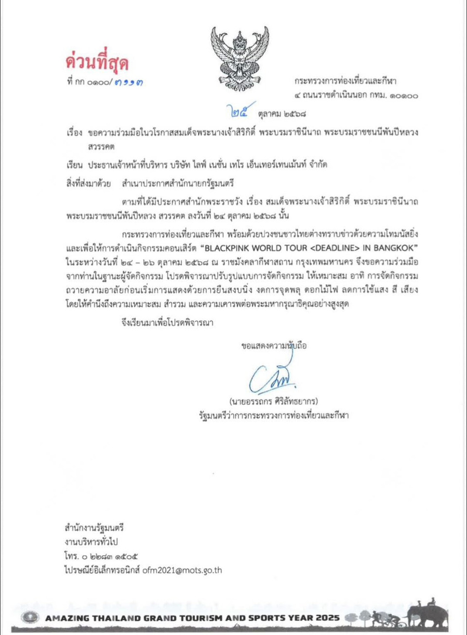 วันที่ 25 ต.ค.2568 นายอรรถกร ศิริลัทธยากร รมว.ท่องเที่ยวและกีฬา ทำหนังสือขอความร่วมมือ ถึง ประธานเจ้าหน้าที่บริหาร บริษัท Live Nation Tero ผู้จัดงานคอนเสิร์ต BLACKPINK WORLD TOUR <DEADLINE> IN BANGKOK ระบุว่า