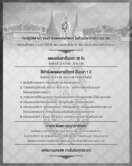 -ให้กำลังพลแต่งกายไว้ทุกข์ เป็นเวลา 1 ปี ตั้งแต่วันที่ 25 ต.ค.68 -24 ต.ค.69 การแต่งกายดังนี้