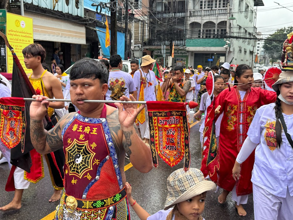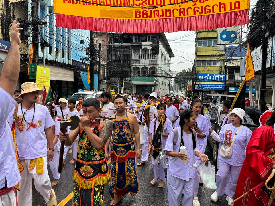 จากนั้นต่อด้วยขบวนเทพเจ้าที่มาประทับร่างม้าทรง ร่วมร้อยองค์ ได้แสดงอิทธิฤทธิ์ต่างๆกันอย่างเต็มที่ บางองค์ ก็ใช้เหล็กแหลมแทงตามกระพุ้งแก้ม ใช้อาวุธมีดดาบขวาน และลูกตุ้มเหล็กแหลม ฟาดฟันหลังตัวเอง และเชือดลิ้ม ด้วยคม ดาบ หอก และมีดโกน ซึ่งเชื่อกันว่าการเข้าทรงของเหล่าเทพเจ้า จะช่วยปัดเป่าสิ่งชั่วร้าย และรับเคราะห์กรรมแทนชาวเมืองทั่วไป