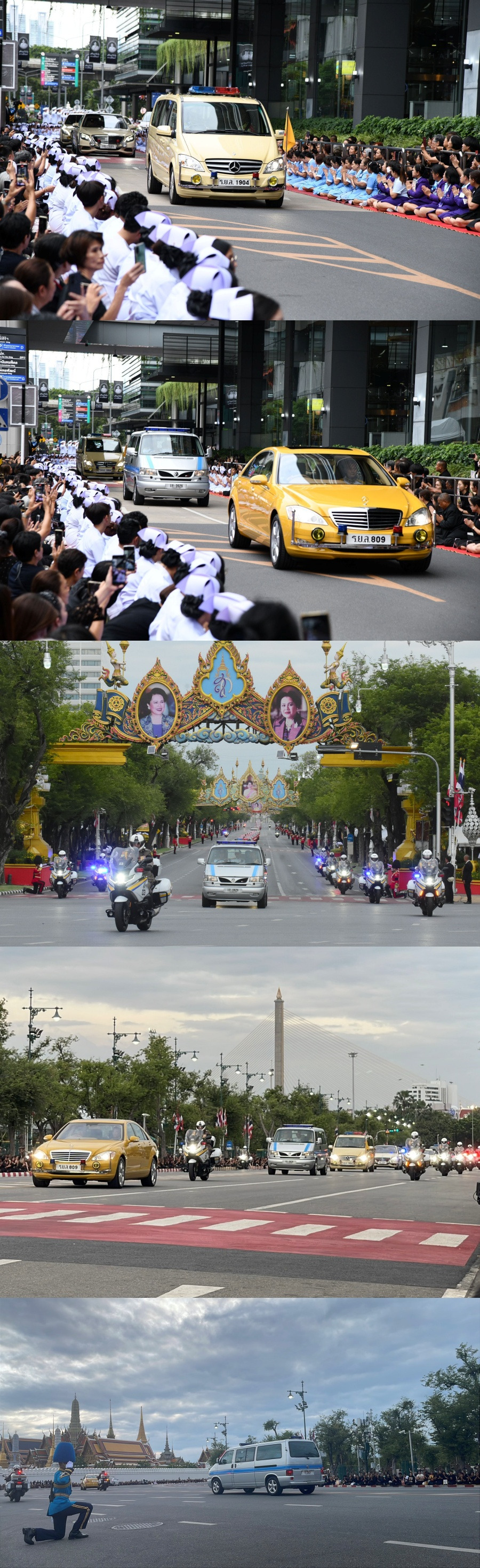 ต่อจากนั้น เมื่อเวลา 16.26 น.สมเด็จพระมหาวีรวงศ์ ผู้ช่วยเจ้าอาวาสวัดราชบพิธสถิตมหาสีมาราม เดินนำขบวนเชิญพระบรมศพ สมเด็จพระนางเจ้าสิริกิติ์ พระบรมราชินีนาถ พระบรมราชชนนีพันปีหลวง โดยมีคณะแพทย์และพยาบาล ที่ถวายการรักษาเชิญพระบรมศพลงจากอาคารภูมิสิริมังคลานุสรณ์ แล้วเชิญพระบรมศพขึ้นรถยนต์หลวง เสร็จแล้ว พระบาทสมเด็จพระเจ้าอยู่หัว และสมเด็จพระนางเจ้า ฯ พระบรมราชินี พร้อมด้วยพระบรมวงศานุวงศ์ ประทับรถยนต์พระที่นั่ง เสด็จพระราชดำเนินตามรถยนต์หลวงเชิญพระบรมศพ ออกจากโรงพยาบาลจุฬาลงกรณ์ สภากาชาดไทย ไปยังพระบรมมหาราชวัง