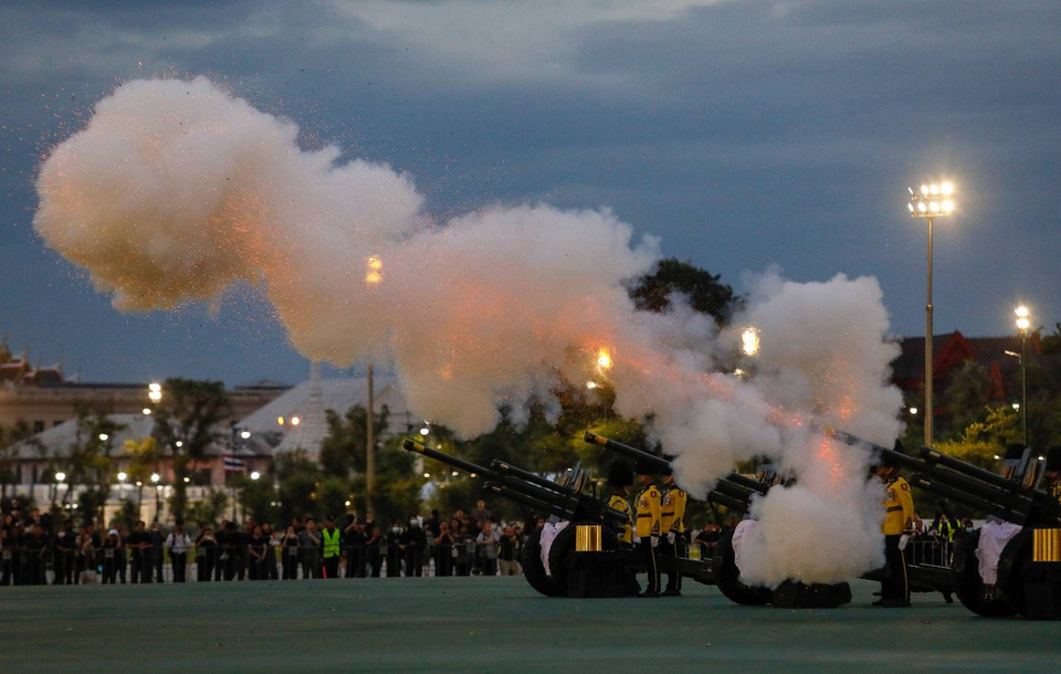 ในการนี้ กองทัพบก โดยกองพันทหารปืนใหญ่ที่ 1 กรมทหารปืนใหญ่ที่ 1 รักษาพระองค์ ได้รับพระราชทานพระบรมราชานุญาตให้ทำการยิงสลุตหลวงถวายพระเกียรติ ด้วยปืนใหญ่เบากระสุนวิถีราบ แบบ 80 ขนาด 75 มิลลิเมตร จำนวน 4 กระบอก บริเวณมณฑลพิธีท้องสนามหลวงฝั่งทิศเหนือ โดยมีทิศทางยิงฝั่งศาลฎีกา ทำการยิงถวายนาทีละ 1 นัด เริ่มตั้งแต่ขณะเริ่มถวายน้ำสรงพระบรมศพ และหยุดยิงเมื่อพระโกศพระบรมศพอัญเชิญขึ้นประดิษฐานเหนือพระแท่นสุวรรณเบญจดล