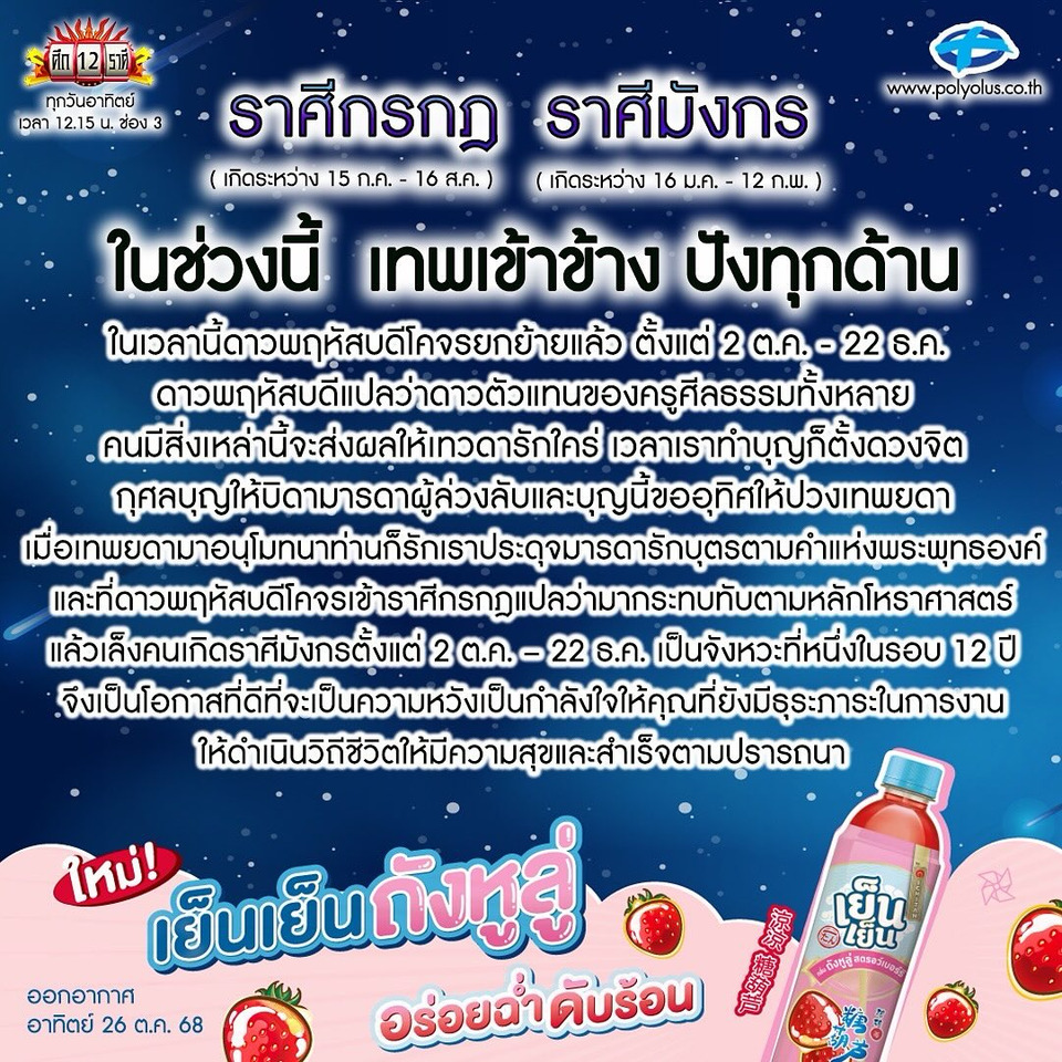 เมื่อวันที่ 27 ต.ค.68 ผู้สื่อข่าวรายงาน เมื่อวานนี้ (26 ต.ค.68) "ลักษณ์ ราชสีห์" หรือ "หมอลักษณ์ ฟันธง" หมอดูชื่อดังของเมืองไทย ทำนายดวงผ่านอินสตาแกรม @polyplus_jad_hai ระบุว่า...