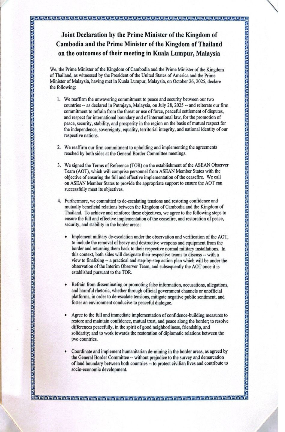 เมื่อวันที่ 27 ต.ค.2568 นายสิริพงศ์ อังคสกุลเกียรติ โฆษกประจำสำนักนายกรัฐมนตรี เปิดเผยว่า การลงนาม Joint Declaration by the Prime Minister of the Kingdom of Cambodia and the Prime Minister of the Kingdom of Thailand on the outcomes of their meeting in Kuala Lumpur, Malaysia โดยนายอนุทิน ชาญวีรกูล นายกรัฐมนตรีและรัฐมนตรีว่าการกระทรวงมหาดไทย ร่วมกับสมเด็จฯ ฮุน มาเนต นายกรัฐมนตรีราชอาณาจักรกัมพูชา ณ กรุงกัวลาลัมเปอร์ ประเทศมาเลเซีย โดยมีประธานาธิบดีโดนัลด์ เจ. ทรัมป์ แห่งสหรัฐอเมริกา และนายกรัฐมนตรีอันวาร์ อิบราฮิม แห่งมาเลเซีย ประธานอาเซียน เข้าร่วมเป็นสักขีพยาน ถือเป็นก้าวสำคัญของทั้งสองประเทศ โดย Joint Declaration ที่มีการลงนามในวันนี้ มีสาระสำคัญ ดังนี้