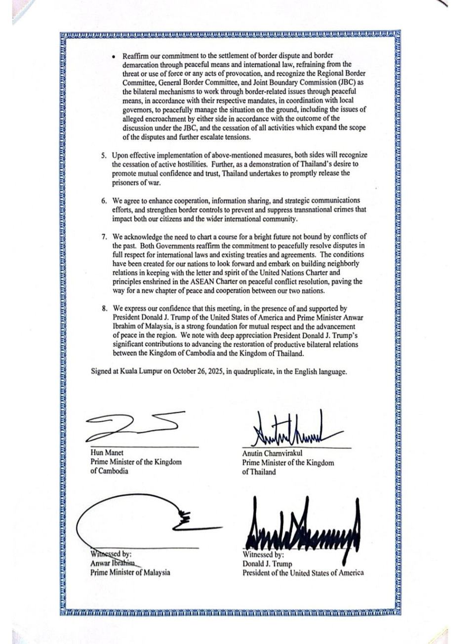 1) ผู้นำไทยและกัมพูชาแสดงเจตนารมณ์ต่อสันติภาพและความมั่นคงระหว่างสองประเทศ ตามที่เคยประกาศไว้ ณ เมืองปุตราจายา เมื่อ 28 กรกฎาคมที่ผ่านมา โดยย้ำความมุ่งมั่นที่จะละเว้นการคุกคามและใช้กำลัง แก้ไขข้อพิพาทโดยสันติ เคารพต่อเขตแดนและกฎหมายระหว่างประเทศ เพื่อส่งเสริมสันติภาพ เสถียรภาพ และความรุ่งเรืองร่วมกันในภูมิภาค