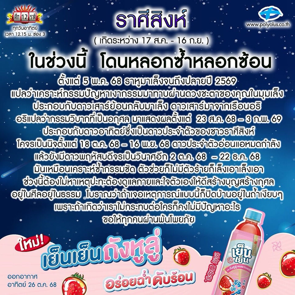 ตั้งแต่ 5 พ.ค. 68 ราหูมาเล็งจนถึงปลายปี 2569แปลว่าเคราะห์กรรมปัญหาเงากรรมมาทาบผ่านดวงชะตาของคุณในมุมเล็ง ประกอบกับดาวเสาร์ย้อนกลับมาเล็ง ดาวเสาร์มาจากเรือนอธิอริแปลว่ากรรมวิบากที่เป็นอกุศล มาแสดงผลตั้งแต่ 23 ส.ค. 68 - 3 ณ. 69 ประกอบกับดาวอาทิตย์ซึ่งเป็นดาวประจำตัวของชาวราศีสิงห์ โคจรเป็นนิจตั้งแต่ 18 ต.ค. 68 - 16 ผ.ย. 68 ดาวประจำตัวอ่อนแอหมดกำลัง แล้วยังมีดาวพฤหัสบดีจรเป็นวินาศอีก 2 ต.ค. 68 - 22 ธ.ค. 68มันเหมือนเคราะห์ซ้ำกรรมซัด ตัวช่วยก็ไม่มีตัวร้ายก็เล็งเอาเล็งเอา ช่วงนี้ต้องไม่หาเหตุปะทะต้องดูแลกายและใจตัวเองให้ดีสร้างบุญสร้างกุศล อยู่ในศีลอยู่ในธรรม โบราณว่าถ้าถ้าเจอเหตุการณ์แบบนี้ก็ปิดบ้านอยู่ในถ้ำเงียบๆเพราะถ้าเกิดว่าเราไม่กระทบต่อใครก็คงไม่มีปัญหาอะไร ขอให้ทุกคนผ่านพ้นโพยภัย ใหม่!