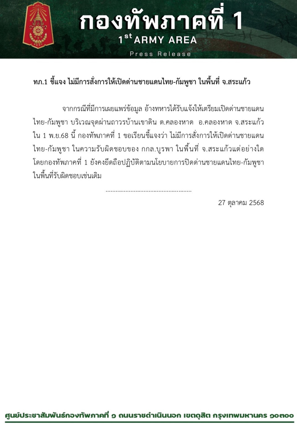 เมื่อวันที่ 27 ตุลาคม 2568 จากกรณีที่มีการเผยแพร่ข้อมูล อ้างทหารได้รับแจ้งให้เตรียมเปิดด่านชายแดนไทย-กัมพูชา บริเวณจุดผ่านถาวรบ้านเขาดิน ต.คลองหาด อ.คลองหาด จ.สระแก้ว ใน 1 พ.ย.68 กองทัพภาคที่ 1 ขอเรียนชี้แจงว่า ไม่มีการสั่งการให้เปิดด่านชายแดนไทย-กัมพูชา ในความรับผิดชอบของ กกล.บูรพา ในพื้นที่ จ.สระแก้วแต่อย่างใด โดยกองทัพภาคที่ 1 ยังคงยึดถือปฏิบัติตามนโยบายการปิดด่านชายแดนไทย-กัมพูชา ในพื้นที่รับผิดชอบเช่นเดิม