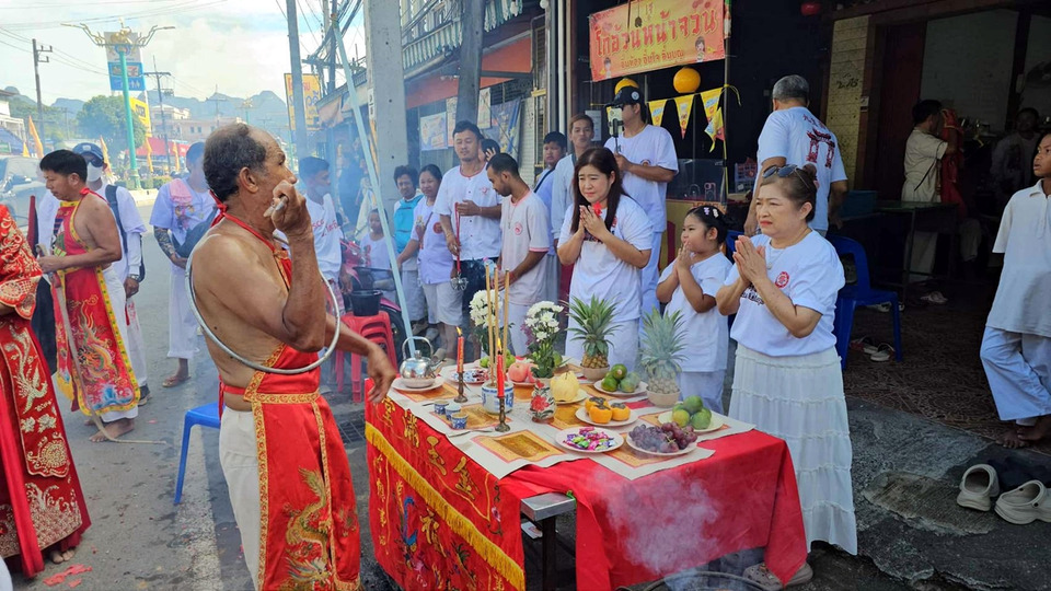 เมื่อเวลา 09.00 น. วันที่ 27 ต.ค.68 ซึ่งเป็นวันที่ 7 ของประเพณีถือศีลกินผัก ปี 2568 บรรดาศาลเจ้าในจังหวัดพังงา นำโดยศาลเจ้าแม่ม่าจ้อโป๋ พร้อมด้วยศาลเจ้าอื่นๆ อีกหลายแห่งในเขต อ.เมืองพังงา และอำเภอใกล้เคียงมากกว่า20 ศาลเจ้า ได้ร่วมกันประกอบพิธีเฉี้ยโห้ย(อัญเชิญไฟศักดิ์สิทธิ์) พร้อมกับพิธีอิ้วเก้ง หรือแห่พระรอบเมือง ซึ่งเปรียบเหมือนเป็นการเสด็จออกประพาสเพื่อโปรดสัตว์หรือทำนองออกเยี่ยมราษฎรของพระมหากษัตริย์ในโบราณ ซึ่งมีบรรดาเหล่าม้าทรงของเทพเจ้าจีน ทั้งผู้ชาย ผู้หญิงกว่า 500 องค์ ร่วมแสดงอิทธิฤทธิ์ด้วยการทรมานร่างกาย โดยการใช้อุปกรณ์นานาชนิด และหลากหลายรูปแบบ ซึ่งส่วนใหญ่เป็นของมีคมทิ่มแทงไปตามอวัยวะต่างๆ ของร่างกาย ซึ่งเชื่อว่าเป็นการรับเคราะห์แทนผู้ถือศีลกินผักตามความเชื่อมาแต่โบราณ