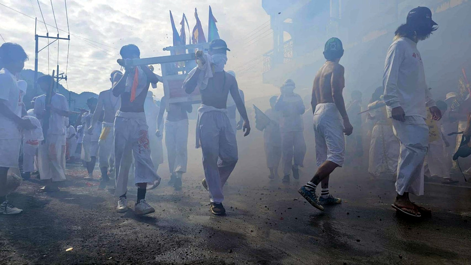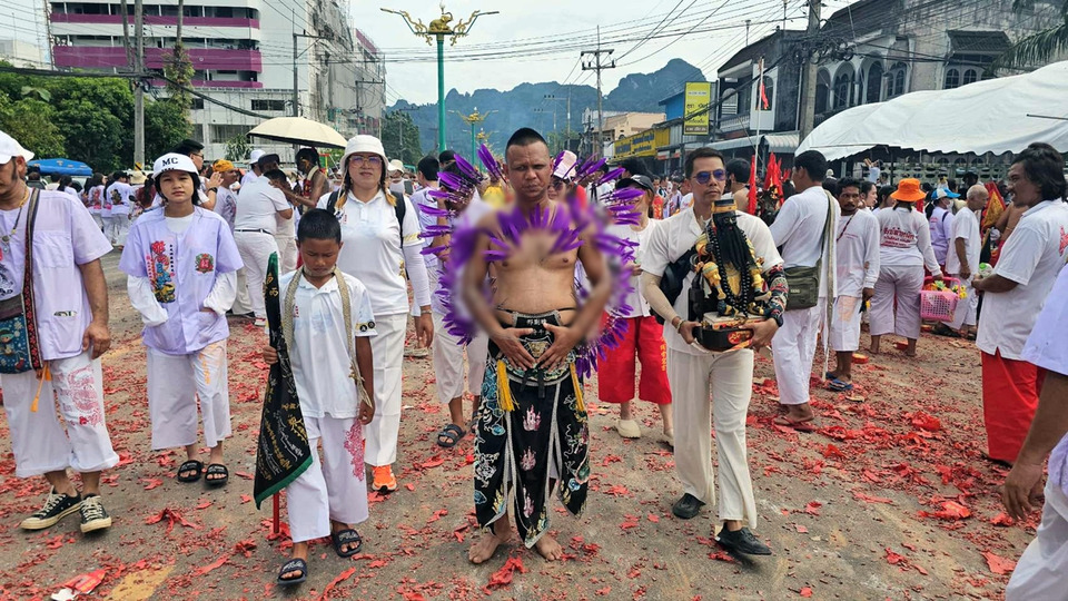 พังงาจัดพิธีอิ้วเก้งแห่พระรอบเมืองในเทศกาลถือศีลกินผัก ปี 2568 ม้าทรงกว่า 500 องค์จาก 20 ศาลเจ้าแสดงอภินิหาร รับเคราะห์แทนประชาชน ขณะที่ชาวจีนและนักท่องเที่ยวกว่า 5,000 คนร่วมชมและทำบุญเพื่อความเป็นสิริมงคล