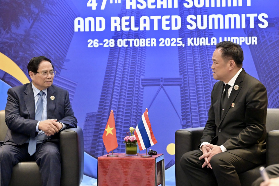 วันที่ 27 ตุลาคม 2568 เวลา 19.30 น. (ตามเวลาท้องถิ่นกรุงกัวลาลัมเปอร์ ซึ่งเร็วกว่ากรุงเทพฯ 1 ชม.) ห้อง 406 ณ ศูนย์ประชุม KLCC กรุงกัวลาลัมเปอร์ ประเทศมาเลเซีย นายอนุทิน ชาญวีรกูล นายกรัฐมนตรีและรัฐมนตรีว่าการกระทรวงมหาดไทย หารือทวิภาคีกับนายฝ่าม มิงห์ จิ๋งห์ (H.E. Mr. Pham Minh Chinh) นายกรัฐมนตรีสาธารณรัฐสังคมนิยมเวียดนาม เพื่อติดตามความคืบหน้าความร่วมมือจากการหารือทางโทรศัพท์ระหว่างกันเมื่อสองสัปดาห์ที่ผ่านมา