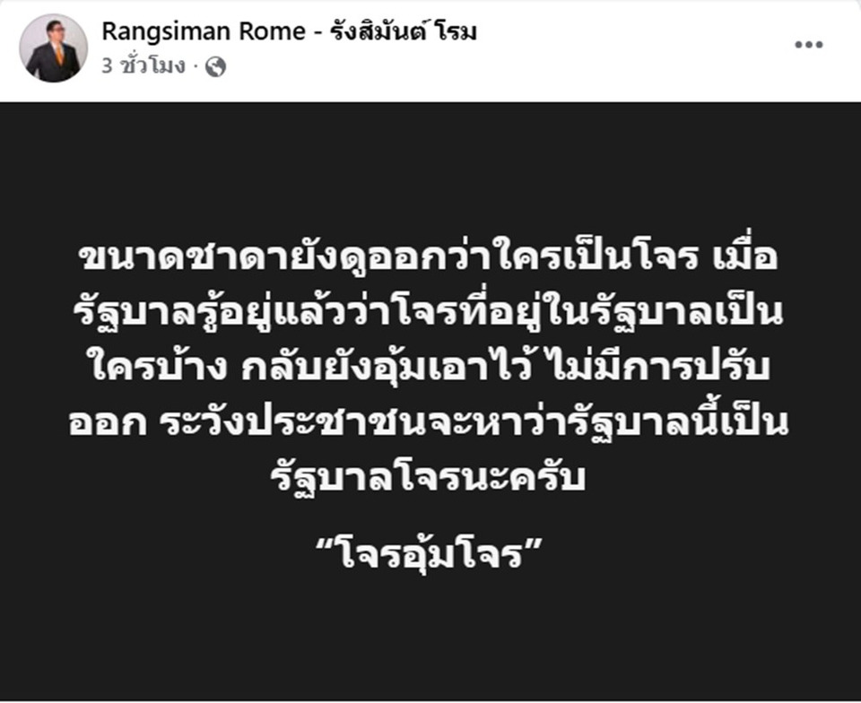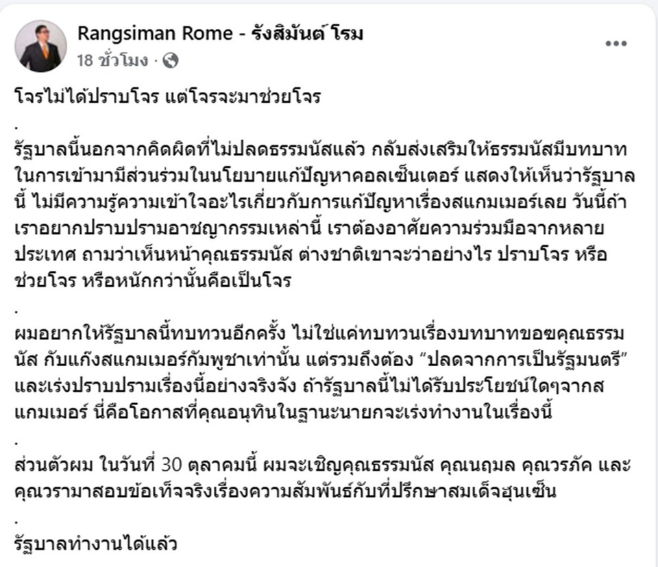 เมื่อวันที่ 28 ต.ค.68 นายรังสิมันต์ โรม สส.บัญชีรายชื่อ และรองหัวหน้าพรรคประชาชน โพสต์เฟซบุ๊กระบุข้อความ ว่า โจรไม่ได้ปราบโจร แต่โจรจะมาช่วยโจร รัฐบาลนี้นอกจากคิดผิด ที่ไม่ปลด ร.อ.ธรรมนัส พรหมเผ่า รองนายกฯ และรมว.เกษตรและสหกรณ์ แล้ว กลับส่งเสริมให้ ร.อ.ธรรมนัส มีบทบาทในการเข้ามามีส่วนร่วมในนโยบายแก้ปัญหาคอลเซ็นเตอร์ แสดงให้เห็นว่ารัฐบาลนี้ ไม่มีความรู้ความเข้าใจอะไรเกี่ยวกับการแก้ปัญหาเรื่องสแกมเมอร์เลย วันนี้ถ้าเราอยากปราบปรามอาชญากรรมเหล่านี้ เราต้องอาศัยความร่วมมือจากหลายประเทศ ถามว่าเห็นหน้า ร.อ.ธรรมนัส ต่างชาติเขาจะว่าอย่างไร ปราบโจร หรือ ช่วยโจร หรือหนักกว่านั้นคือเป็นโจร ผมอยากให้รัฐบาลนี้ทบทวนอีกครั้ง ไม่ใช่แค่ทบทวนเรื่องบทบาทของ ร.อ.ธรรมนัส กับแก๊งสแกมเมอร์กัมพูชาเท่านั้น แต่รวมถึงต้อง “ปลดจากการเป็นรัฐมนตรี” และเร่งปราบปรามเรื่องนี้อย่างจริงจัง ถ้ารัฐบาลนี้ไม่ได้รับประโยชน์ใดๆ จากสแกมเมอร์ นี่คือโอกาสที่คุณอนุทินในฐานะนายกจะเร่งทำงานในเรื่องนี้