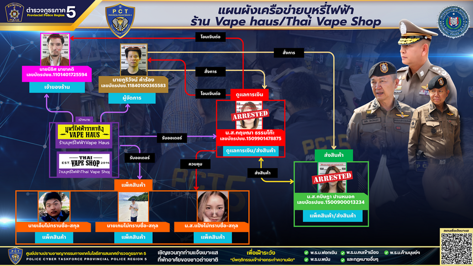ในกรณีนี้ ศูนย์ปราบปรามอาชญากรรมเทคโนโลยีสารสนเทศ ตำรวจภูธรภาค 5 (ศปอส.ภ.5) ร่วมกับ บก.สส.ภ.5 ได้ทำการสืบสวนจนทราบว่ามีกลุ่มบุคคลลักลอบจำหน่ายบุหรี่ไฟฟ้าผ่านเว็บไซต์ ชื่อ “vapehaus URL: https://vapehaus.net” โดยมีรูปแบบการสั่งซื้อสินค้าออนไลน์และจัดส่งทางขนส่งถึงบ้าน จึงได้สืบสวนจนทราบว่ากลุ่มลักลอบจำหน่ายดังกล่าวมีสถานที่ตั้งของการกระทำความผิดจำนวน 3 จุด คือ ในพื้นที่ อ.เมืองเชียงใหม่ 1 จุด และ อ.หางดง จ.เชียงใหม่ 2 จุด จึงได้รวบรวมข้อมูลและขออนุมัติศาลเพื่อทำการตรวจค้น