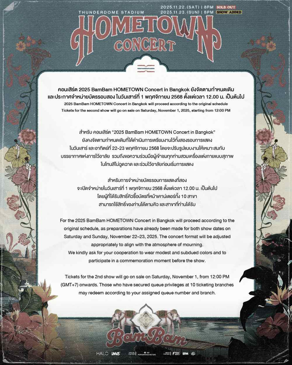 งานคอนเสิร์ตแบมแบม จัดงานตามกำหนดการเดิม และสำหรับในรอบการแสดงที่สอง จะเปิดขายบัตรในวันเสาร์นี้ สำหรับ คอนเสิร์ต “2025 BamBam HOMETOWN Concert in Bangkok”