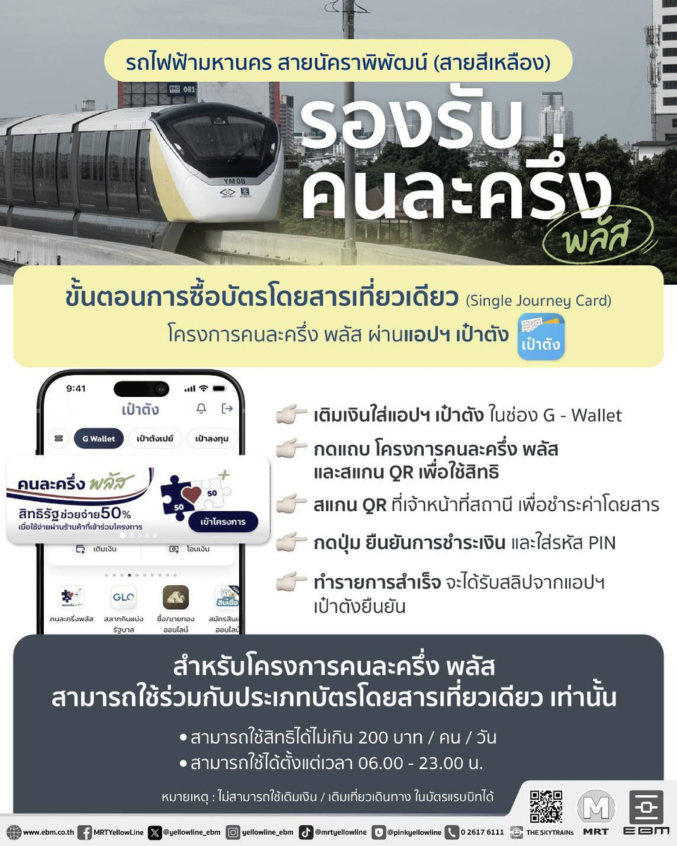 ผู้ได้รับสิทธิ์ในโครงการ “คนละครึ่ง พลัส” สามารถใช้สิทธิ์ชำระค่าโดยสารรถไฟฟ้าผ่านแอปพลิเคชัน “เป๋าตัง” (G-Wallet) ได้ตั้งแต่วันที่ 29 ตุลาคม ถึง 31 ธันวาคม 2568 ที่ห้องจำหน่ายบัตรโดยสารทุกสถานี ของรถไฟฟ้า MRT ทั้ง 4 สาย ระหว่างเวลา 06.00 – 23.00 น.