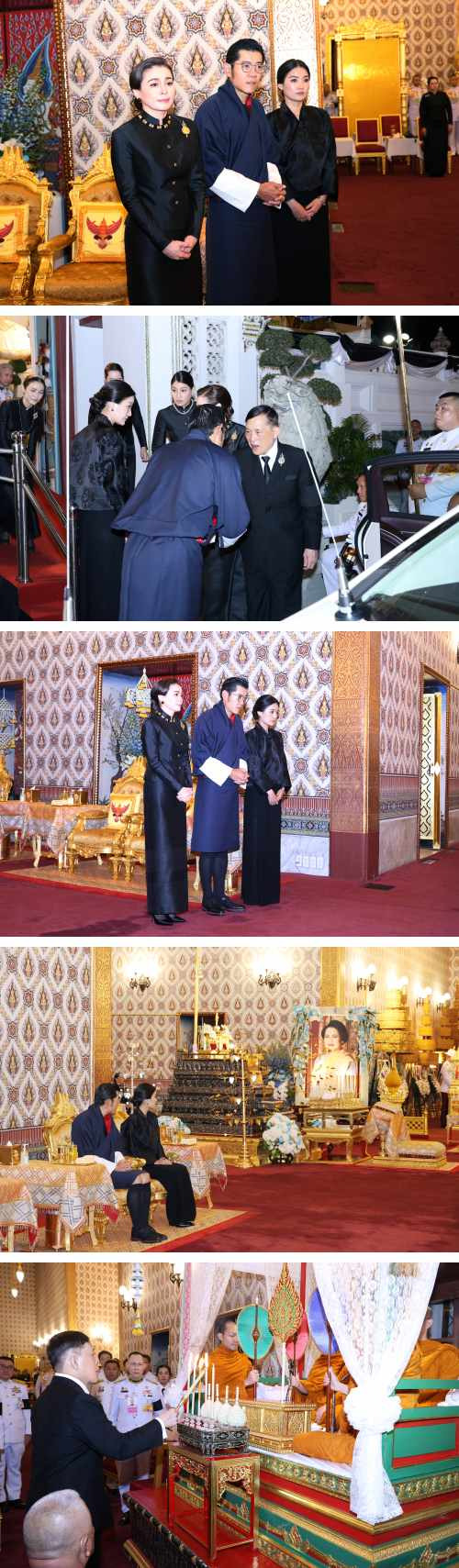 ครั้นเมื่อเสด็จพระราชดำเนินถึง เสด็จเข้าพระที่นั่งราชกรัณยสภา พระบาทสมเด็จพระเจ้าอยู่หัวและสมเด็จพระนางเจ้า ฯ พระบรมราชินี ทรงมีพระราชปฏิสันถาร กับสมเด็จพระราชาธิบดีแห่งภูฏาน และสมเด็จพระราชินีแห่งภูฏาน ที่เสด็จพระราชดำเนินมาทรงร่วมบำเพ็ญพระราชกุศลพระพิธีธรรมสวดพระอภิธรรมพระบรมศพสมเด็จพระนางเจ้าสิริกิติ์ พระบรมราชินีนาถ พระบรมราชชนนีพันปีหลวง จากนั้น เสด็จพระราชดำเนินไปยังพระที่นั่งดุสิตมหาปราสาท พระบาทสมเด็จพระเจ้าอยู่หัว และสมเด็จพระนางเจ้า ฯ พระบรมราชินี เสด็จพระราชดำเนินไปทรงจุดธูปเทียนเครื่องทองน้อย ที่หน้าพระโกศพระบรมศพสมเด็จพระนางเจ้าสิริกิติ์พระบรมราชินีนาถ พระบรมราชชนนีพันปีหลวง ทรงกราบ พระบาทสมเด็จพระเจ้าอยู่หัว ทรงจุดธูปเทียนเครื่องนมัสการพานทองสองชั้นบูชาพระพุทธรูปประจำพระชนมวาร ที่หน้าพระแท่นพระนพปฎลมหาเศวตฉัตร ทรงกราบ