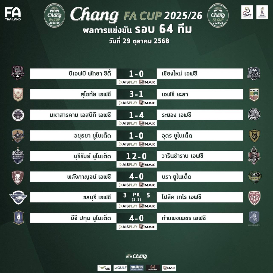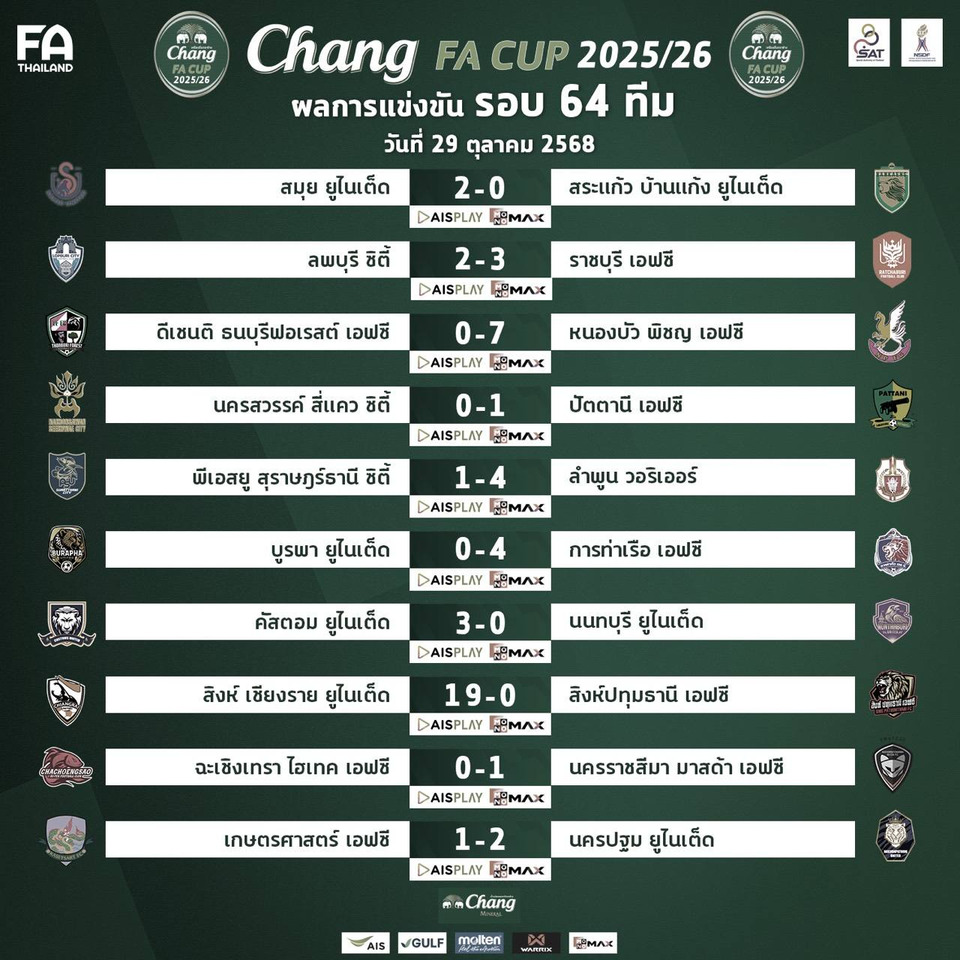 ผลการแข่งขันรอบ 64 ทีมสุดท้าย วันพุธที่ 29 ตุลาคม 2568