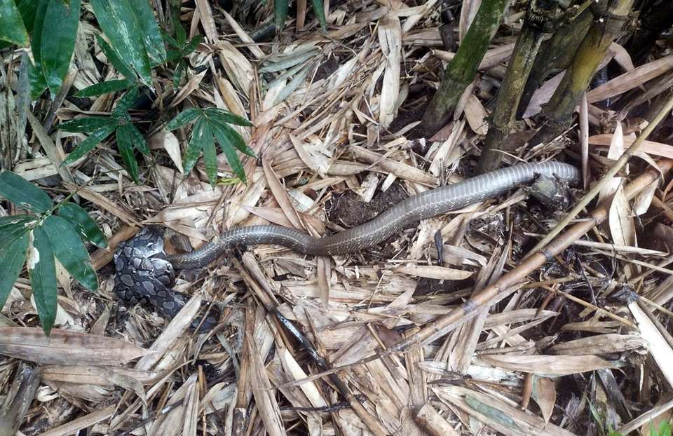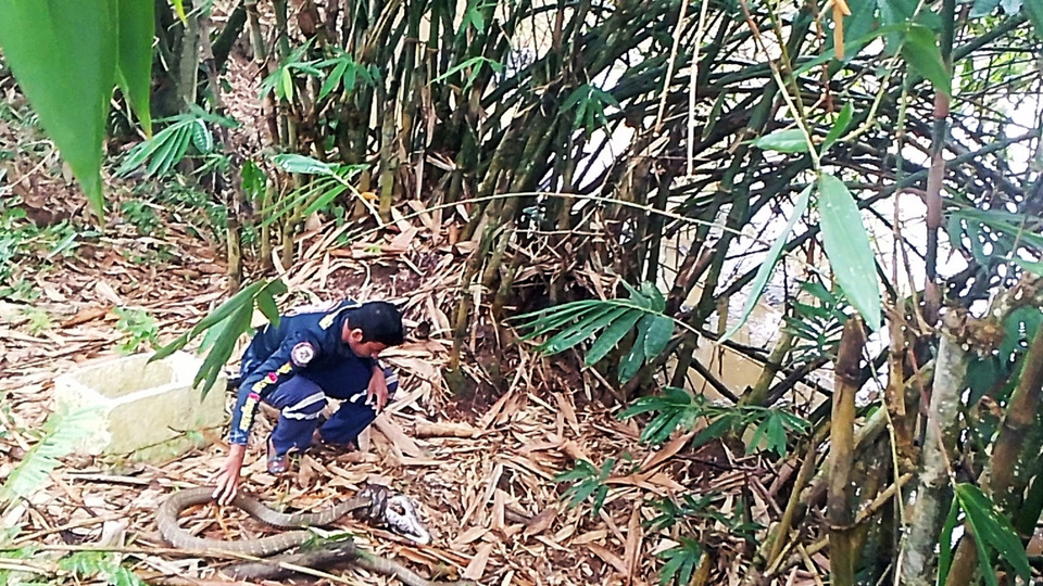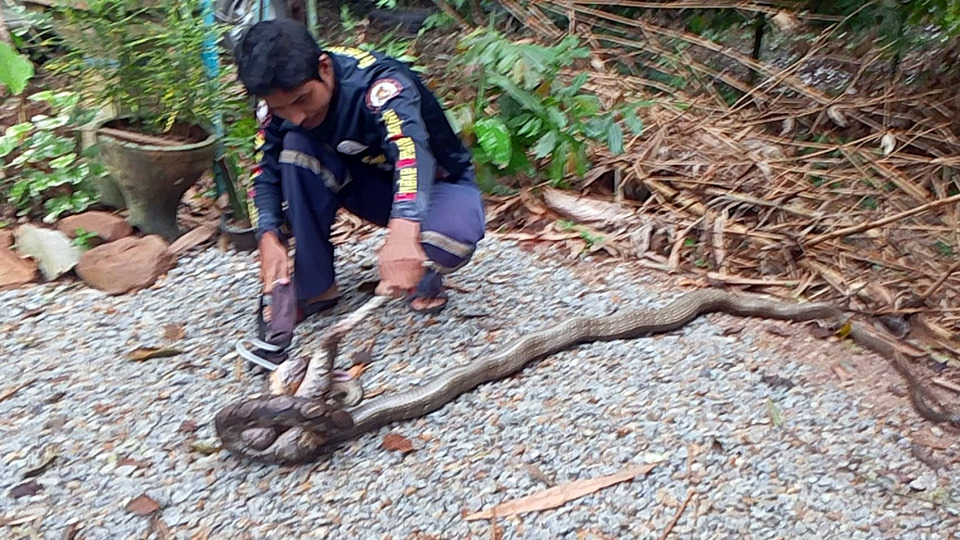 วันที่ 30 ต.ค.68 ทีมปราบอสรพิษอาสาพิทักษ์งู จ.สงขลา และ กู้ชีพ อบต.สะท้อน โดยการนำของนายทวีศักดิ์ บุญเศษ ฯกำลังออกปฎิบัติหน้าที่อยู่ในพื้นที่ อ.นาทวี จ.สงขลา ก็ได้รับแจ้งจากนางอุมา อุทยมกุล อายุ 62 ปี อยู่บ้านเลขที่ 66/1 ม.8 บ้านซองใต้ ต.นาทวี อ.นาทวี จ.สงขลา ขอความช่วยเหลือจับงู ว่ามีงูจงอางกำลังรัดกับงูเหลือมอยู่บริเวณกอไผ่หน้าบ้าน เกรงว่าจะเป็นอันตรายกับคนในบ้านเลย ขอให้เจ้าหน้าที่ฯช่วยมาจับให้ด้วย