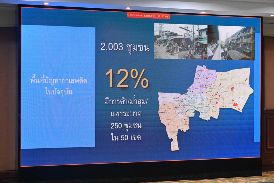สำนักงานปปส.กทม. รายงานสถานการณ์ปัญหายาเสพติดในภาพรวมว่า กรุงเทพมหานครเป็นพื้นที่การค้าและแพร่ระบาดที่สำคัญ โดยมีจำนวนผู้ถูกจับคดียาเสพติดเฉลี่ย 5 ปี (2563 – 2567) อยู่ที่ 10,876 คน ปัจจุบันมี 250 ชุมชน (คิดเป็น 12% ของชุมชนทั้งหมด 2,003 ชุมชน) ที่มีปัญหาการค้าและมั่วสุมยาเสพติด สิ่งที่น่ากังวลคือพบว่าแนวโน้มผู้เข้าไปเกี่ยวข้องทั้งการค้าและเสพเป็นรายใหม่และอายุน้อยลง ด้านชนิดยาเสพติดแม้ยาบ้าและไอซ์ยังเป็นปัญหาหลักแต่มีแนวโน้มของยาอีและคีตามีนเพิ่มมากขึ้น ทั้งนี้ เพื่อเป็นการตัดวงจรยาเสพติดไม่ให้แพร่กระจายลงตามชุมชนมากไปกว่านี้ ลดโอกาสการเข้าถึงยาเสพติดและผู้เสพรายใหม่ สำนักงาน ปปส.กทม. ได้เสนอแนวทางปฏิบัติการร่วมกับหน่วยงานที่เกี่ยวข้อง ในการเปิดปฏิบัติการในชุมชนเป้าหมาย เน้นเฝ้าระวังในกลุ่มประชากรแฝงซึ่งเป็นผู้ก่อปัญหาค้ายาเสพติดส่วนใหญ่ ที่กระจายอยู่ตามห้องแบ่งเช่า บ้านเช่า หอพัก และรณรงค์ป้องกันยาอี/คีตามีนในพื้นที่เสี่ยงอย่างเคร่งครัด